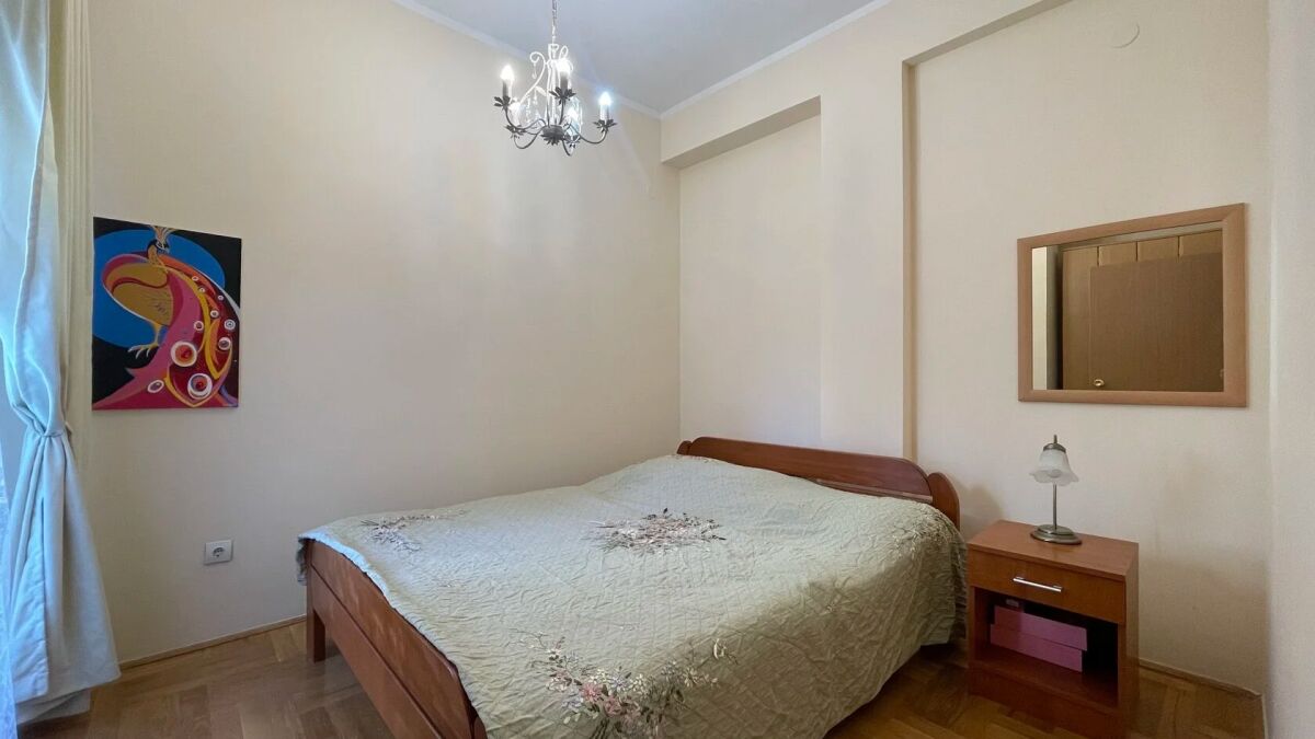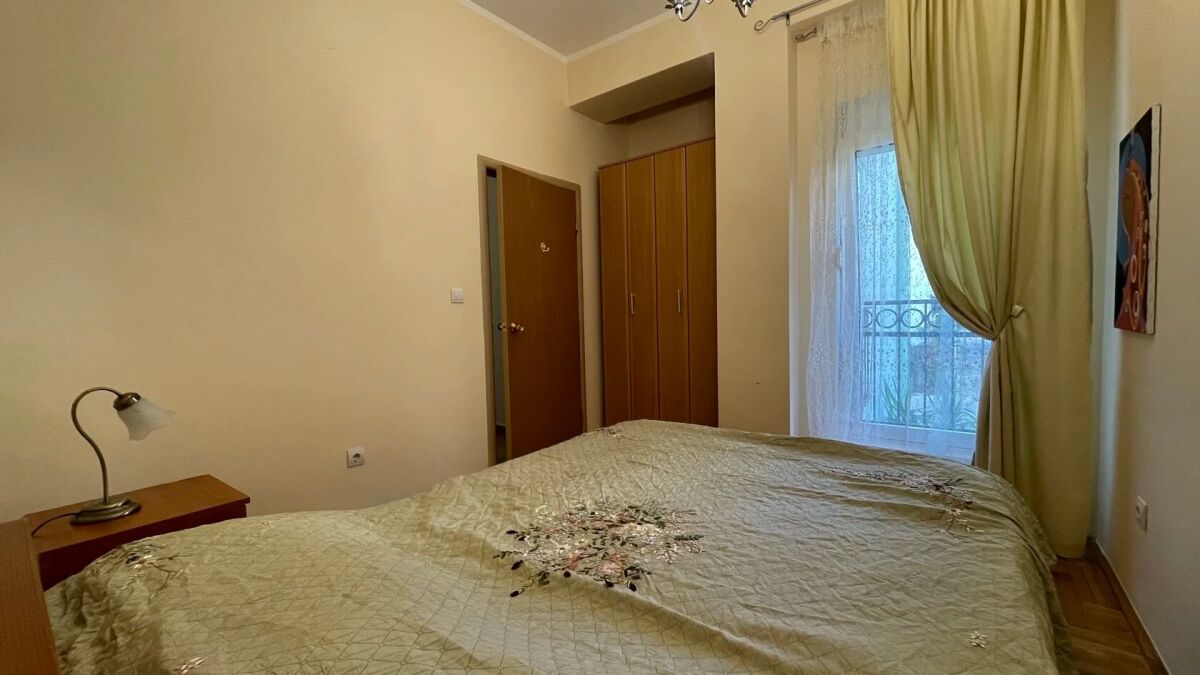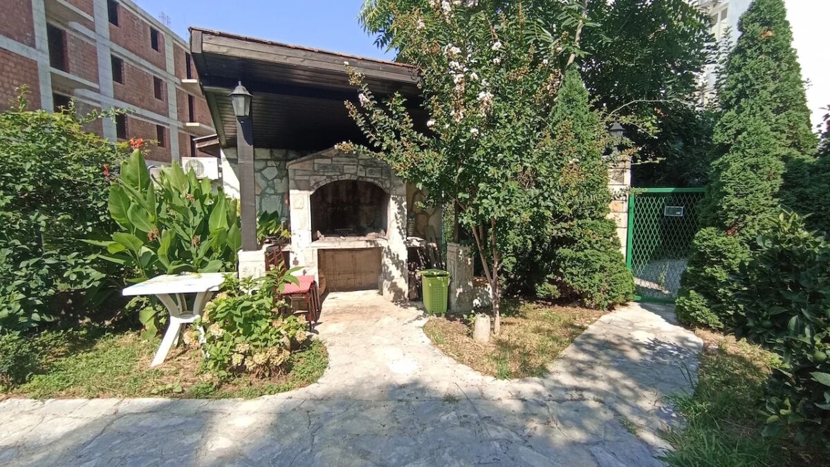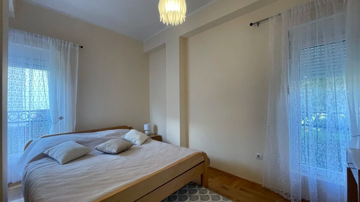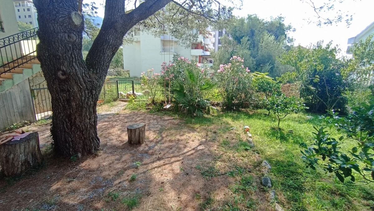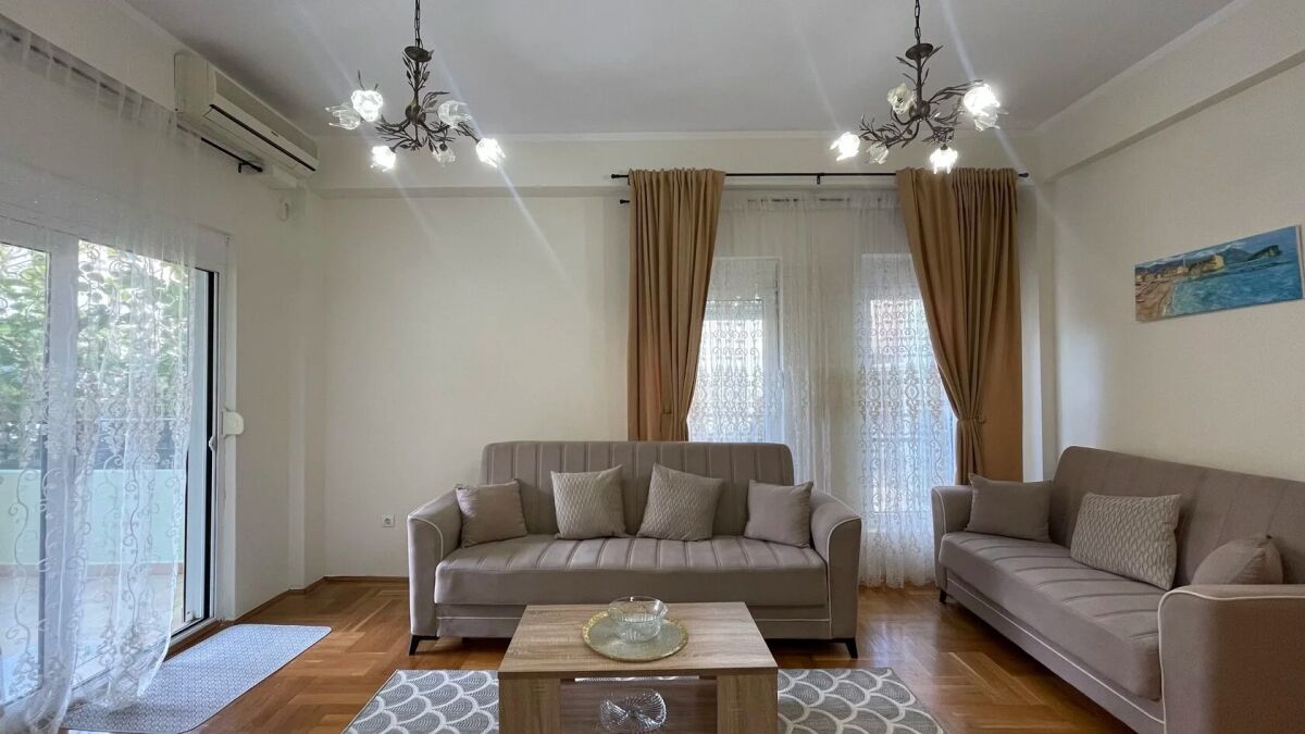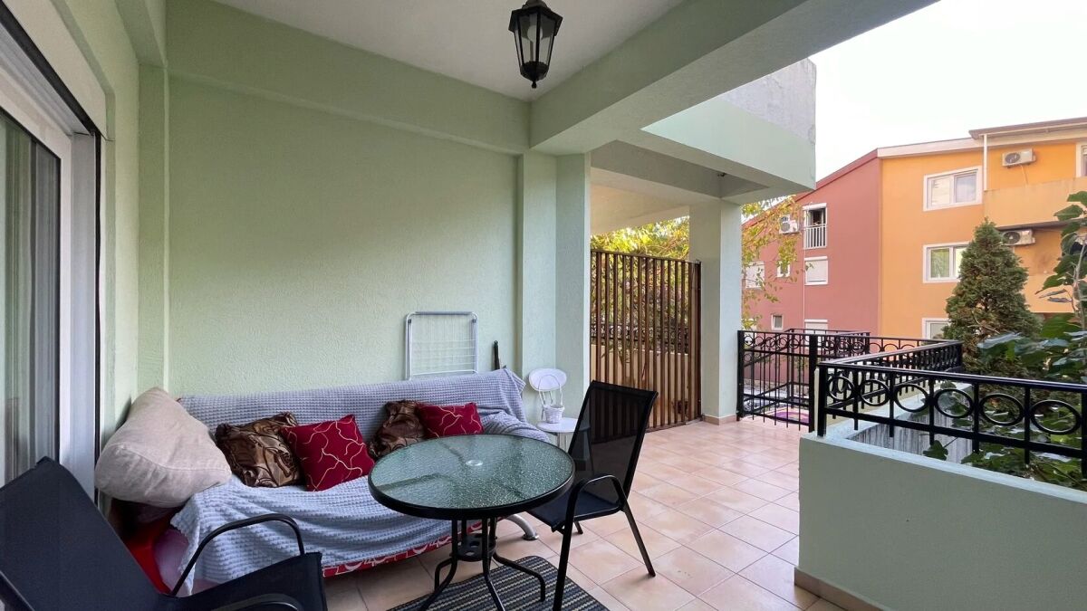 Квартира находится на первом этаже четырехэтажного здания, выполненного в классическом приморском стиле. Она расположена в районе с развитой городской инфраструктурой. На пешеходном расстоянии находятся магазин и ресторан Parma. Расстояние до моря составляет около 1,2 километра. Общая площадь квартиры составляет 78 м² (включая дополнительную площадь террасы в 14 м²). Квартира ориентирована во внутренний двор с видом на сад и бассейн. Вход и лестница аккуратные. Лифта нет. Квартира состоит из двух спален, коридора, гостиной с столовой и кухней, ванной комнаты с душем и просторной террасы. Внутреннее оформление выполнено современными, качественными материалами. Паркет, сантехника и керамика европейского качества, а окна имеют защитные жалюзи. Квартира полностью меблирована. Установлена кухонная техника, стиральная машина и кондиционер.