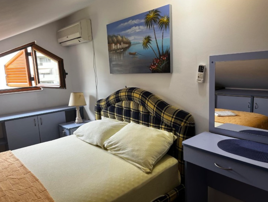 Квартира - дуплекс площадью 70м2 на 4 этаже в самом центре Будвы, Gospoština. Структура квартиры, внизу: гостиная, кухня со столовой, терраса, санузел с окном, лестница, наверху: 2 спальни. С мебелью и со всей бытовой техникой. В каждой комнате кондиционер. Дом 2005 года, общественная парковка. До моря и Старого города 5 минут пешком. Вся городская инфраструктура поблизости.