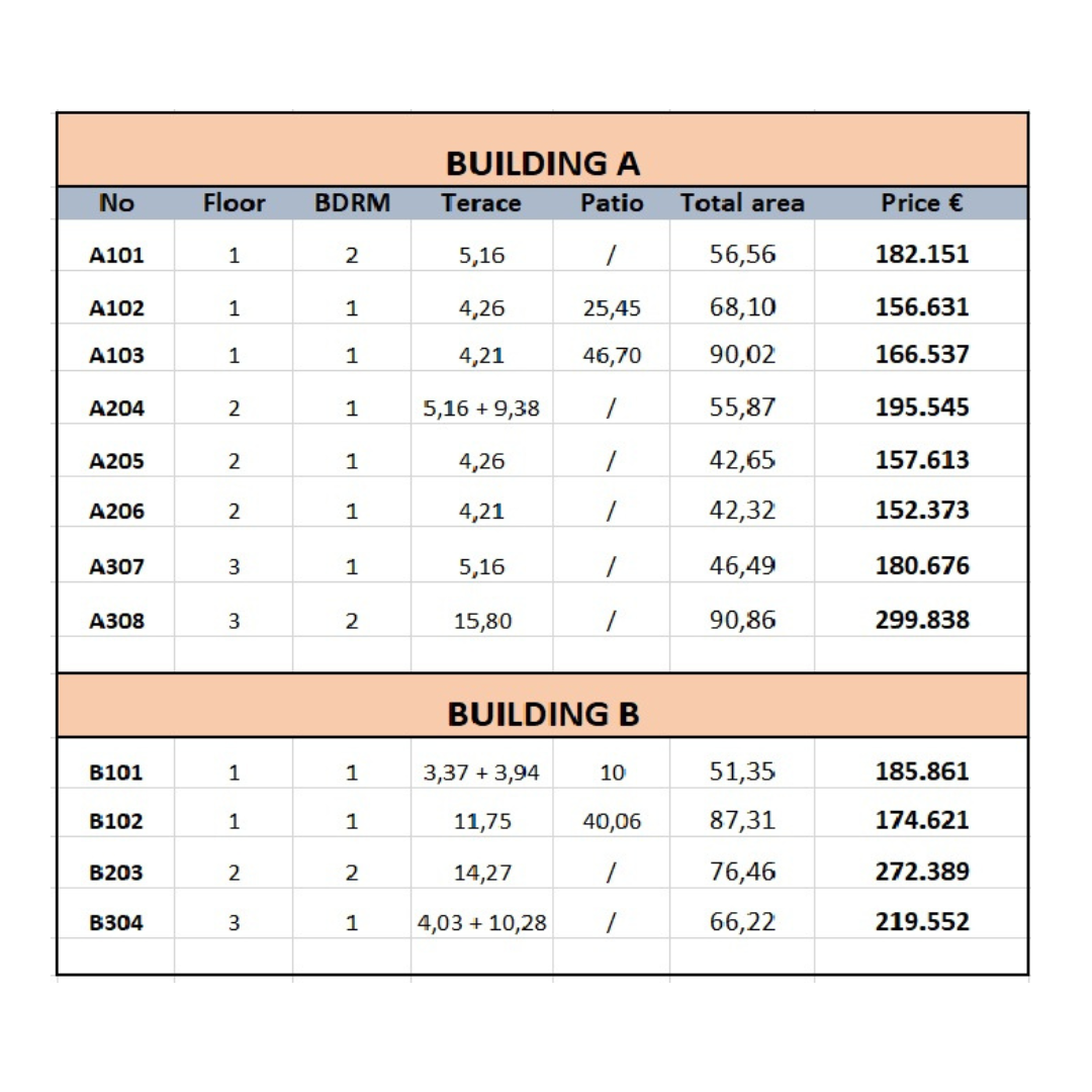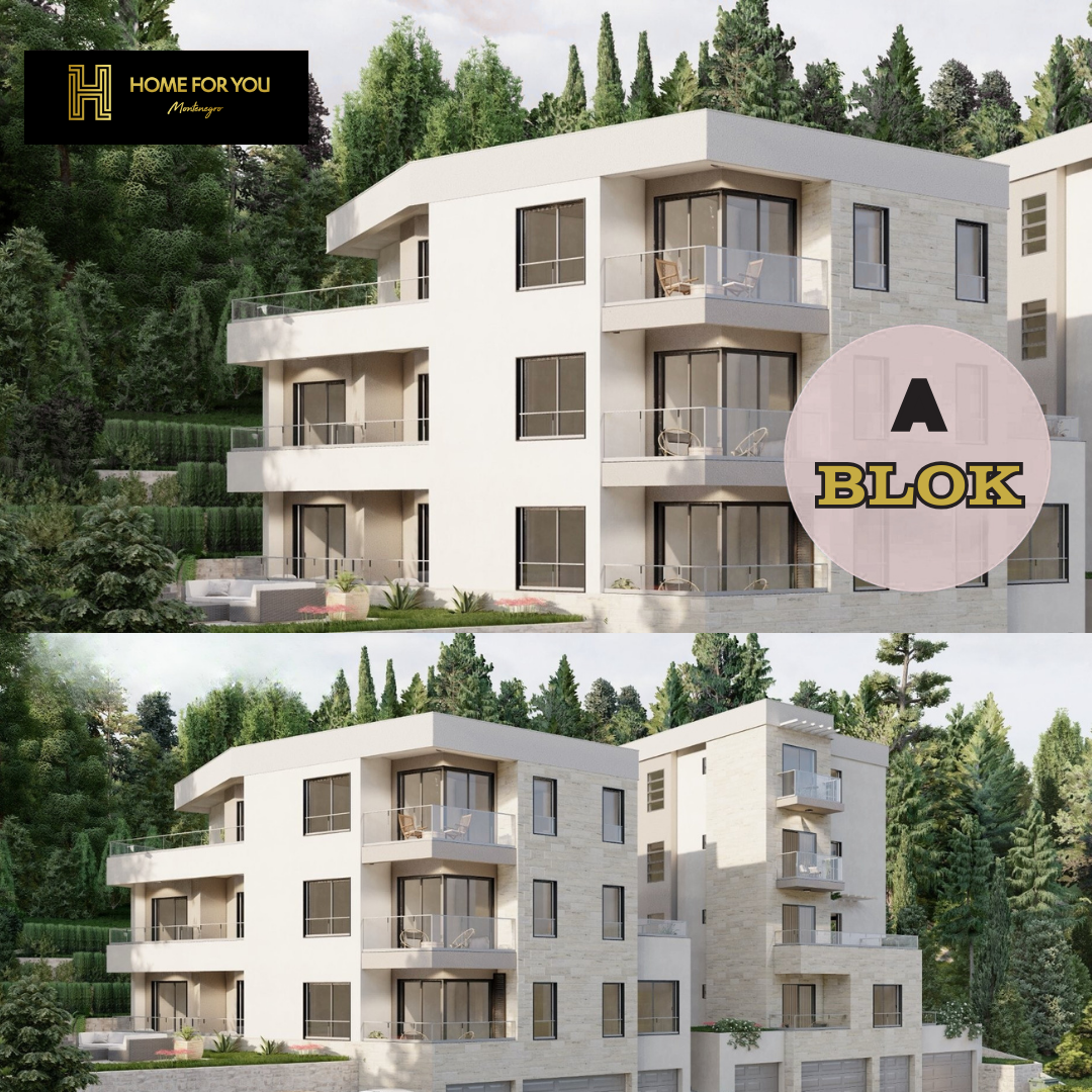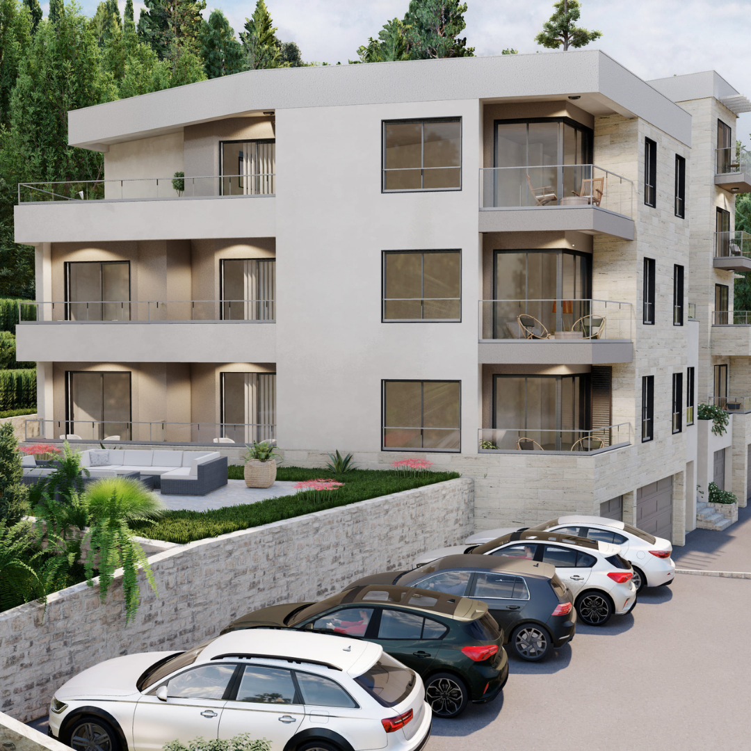 Комплекс состоит из двух зданий (Блок А и Б) с одно- и двухкомнатными квартирами площадью от 42 м² до 90 м². Квартиры на первом этаже имеют частные дворы. Панорамные окна обеспечивают обилие естественного света и прекрасный вид на море и город. На пешеходном расстоянии до Порто Монтенегро Аэропорт Тиват: 10 минут езды Динамика платежей по договоренности Парковка: открытая (5.000€) и гаражная (10.000€) Срок завершения 01.04.2026 года.