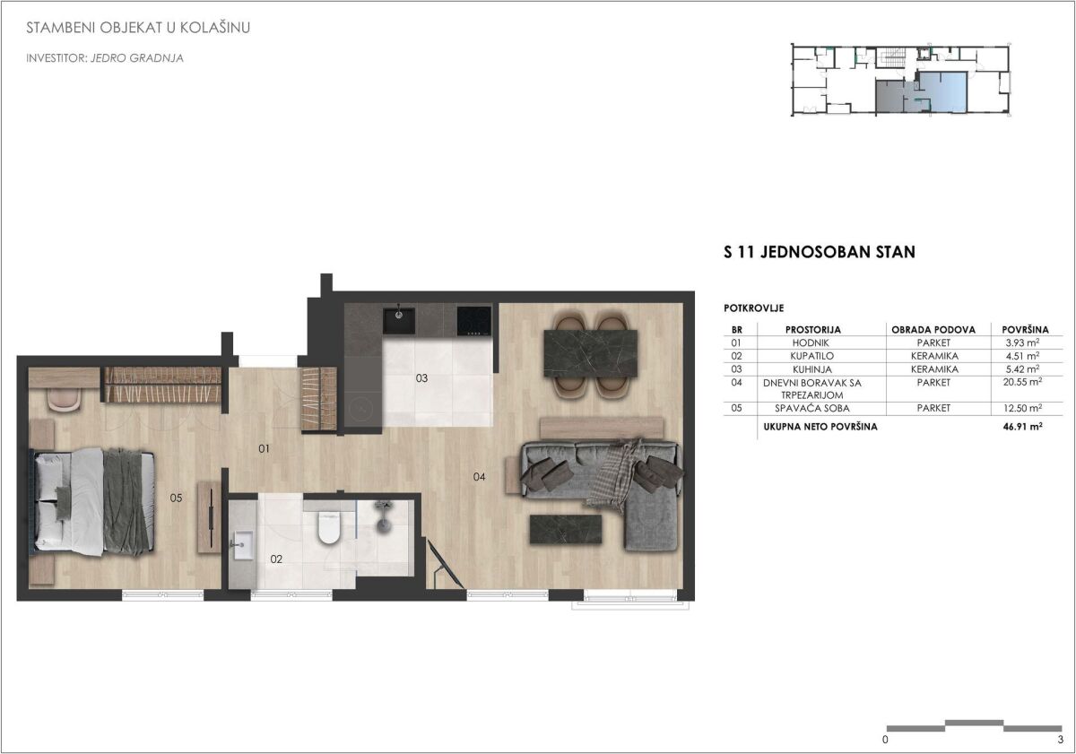 Продается строящаяся двухкомнатная квартира в комплексе Tara Residence в Колашине. Здание расположено рядом с фешенебельными отелями Бреза и будущим Сплендид. Квартира расположена на мансарде дома и имеет площадь 47 м2. Эта квартира предлагает другую концепцию строительства и жизни на природе, с исключительным выбором строительных материалов. Кондиционеры Wi-Fi, норвежские радиаторы, исключительные паркетные полы, полы с подогревом, а также алюминиевые замки — это лишь некоторые из особенностей, которые вы получаете, покупая квартиру в этом комплексе. Каждый сегмент конструкции этого здания тщательно спроектирован, ничто не оставлено на волю случая. Покупка недвижимости в этом комплексе представляет собой исключительную инвестицию, как для жизни, так и для жилья. В здании есть лифт и раздевалка, под пандусом имеется парковка, а также гаражные места. Будущий покупатель освобождается от уплаты налогов. Оплата может быть произведена тремя частями: 60% при подписании договора, 30% во время строительства и оставшиеся 10% по завершении работ.