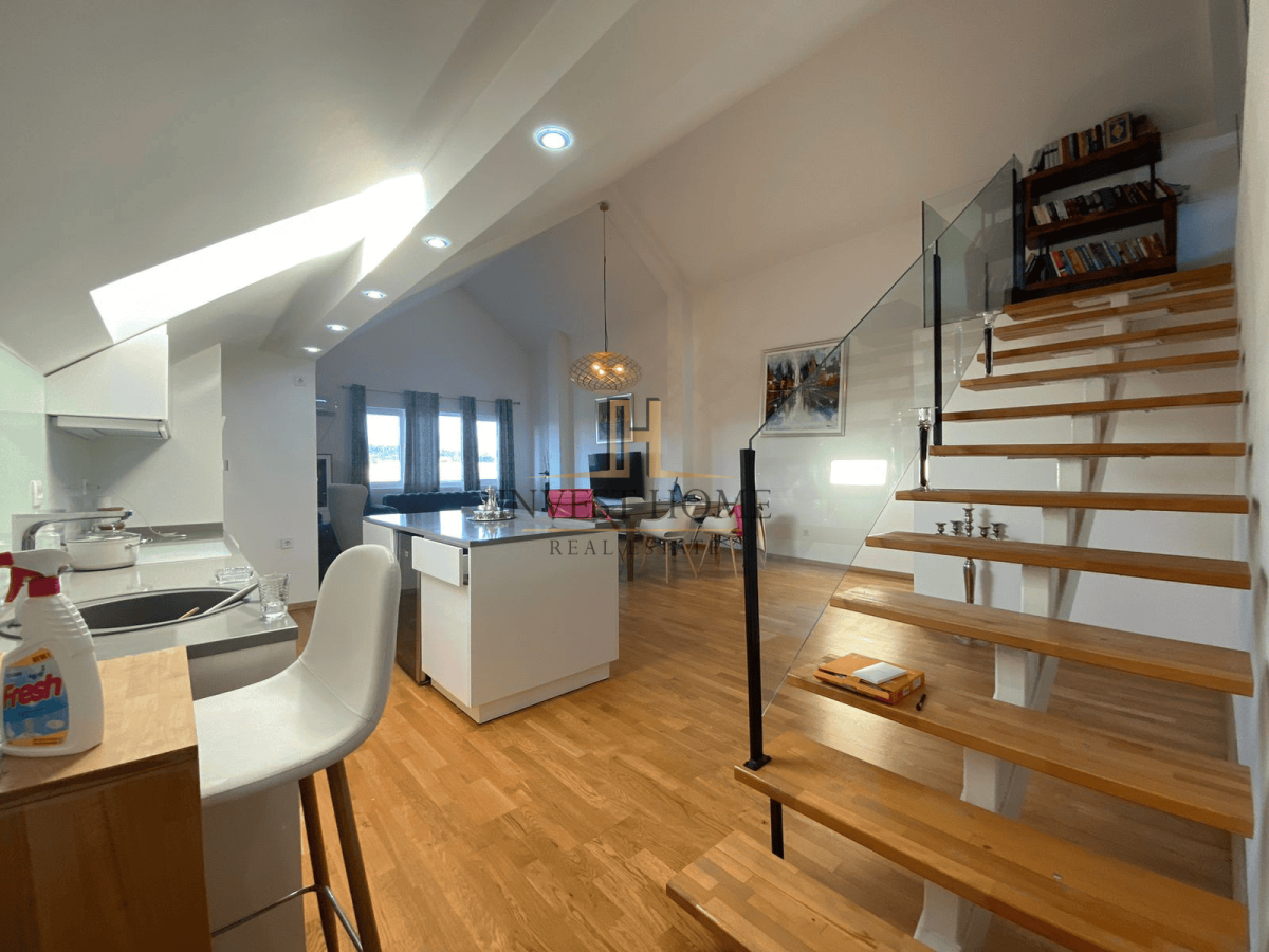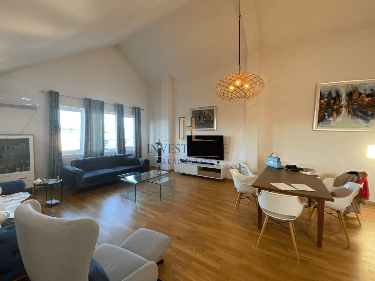 Продается пентхаус на Старом Аэродроме площадью 116м2 (полезная площадь 140м2). Полностью меблирован, очень хорошей планировки, с двумя спальнями, одна из которых апартаментного типа. Находится рядом с торговым центром Forum, также рядом школа, детский сад, поликлиника, парк с детской площадкой и другими важными городскими удобствами. Продается с гаражным и парковочным местом.