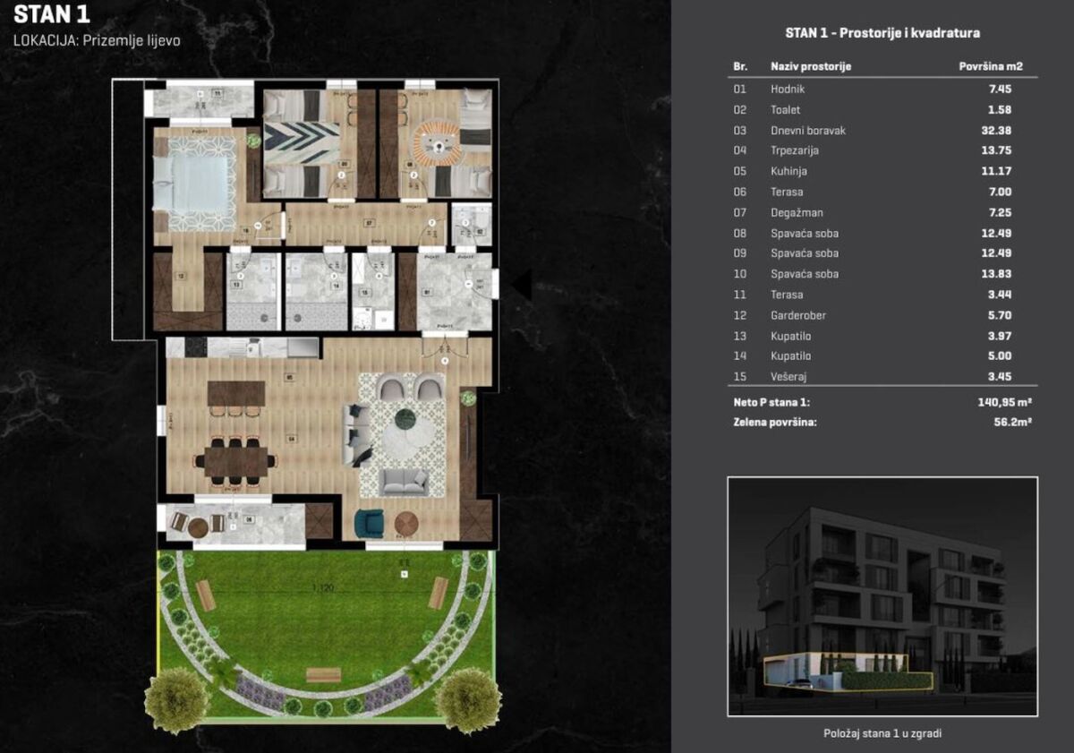 Роскошная трехкомнатная меблированная квартира площадью 137 м2 в Старой Вароши в Подгорице выставлена на продажу. Она расположена на первом этаже в здании Kings Residence, на улице Краля Николе, в нескольких минутах от центра города, холма Любович и района Преко Мораче. Квартира имеет отличную планировку и очень комфортна, также имеется двор площадью 50 м2. Планировка: большая гостиная, столовая и кухня, а также три комнаты, одна из которых — главная спальня с собственной ванной комнатой и гардеробной, две детские комнаты, 2 ванные комнаты и туалет, гардероб, прачечная, терраса. В квартире также есть два гаражных места, а также техническое помещение, организованное как прачечная, в котором установлен тепловой насос, как самая современная форма отопления/охлаждения, бренд DAIKIN, цифровая версия, который также регулирует теплый пол, установленный во всей квартире. Квартира оборудована современными материалами, дорогой мебелью, а также высококачественной встроенной техникой на кухне и в прачечной, бренд BOSCH, и в квартире установлена система Smart Home. Здание современное, построено из качественных материалов, алюминиевые конструкции Alumil, а также итальянская керамика и французские полы. В здании есть ресепшн, а также круглосуточное видеонаблюдение, гараж открывается с помощью считывателя номерных знаков. Во дворе здания есть детская площадка, которую можно контролировать через телевизионный экран в самой квартире с помощью камеры, которая следит за площадкой. В здании 10 квартир, по 2 квартиры на этаже — закрытая система жилья.