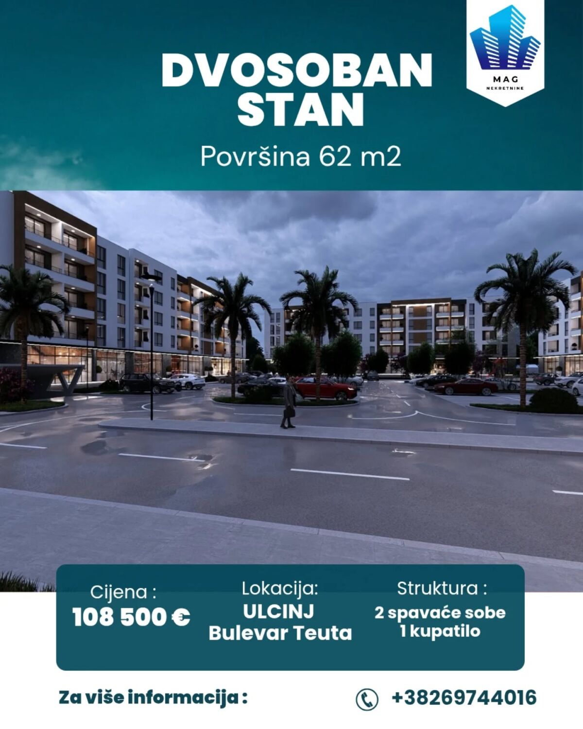 На продажу двухкомнатная квартира в строительстве в Ульцине, Бульвар Теута Площадь 62 м2 Квартира состоит из гостиной с кухней, двух спальных комнат, ванной и террасы Частичная оплата до завершения работ. Окончание работ ожидается в июле 2027 года Освобождена от налога при покупке квартиры Цена 108 500€ +38269744016