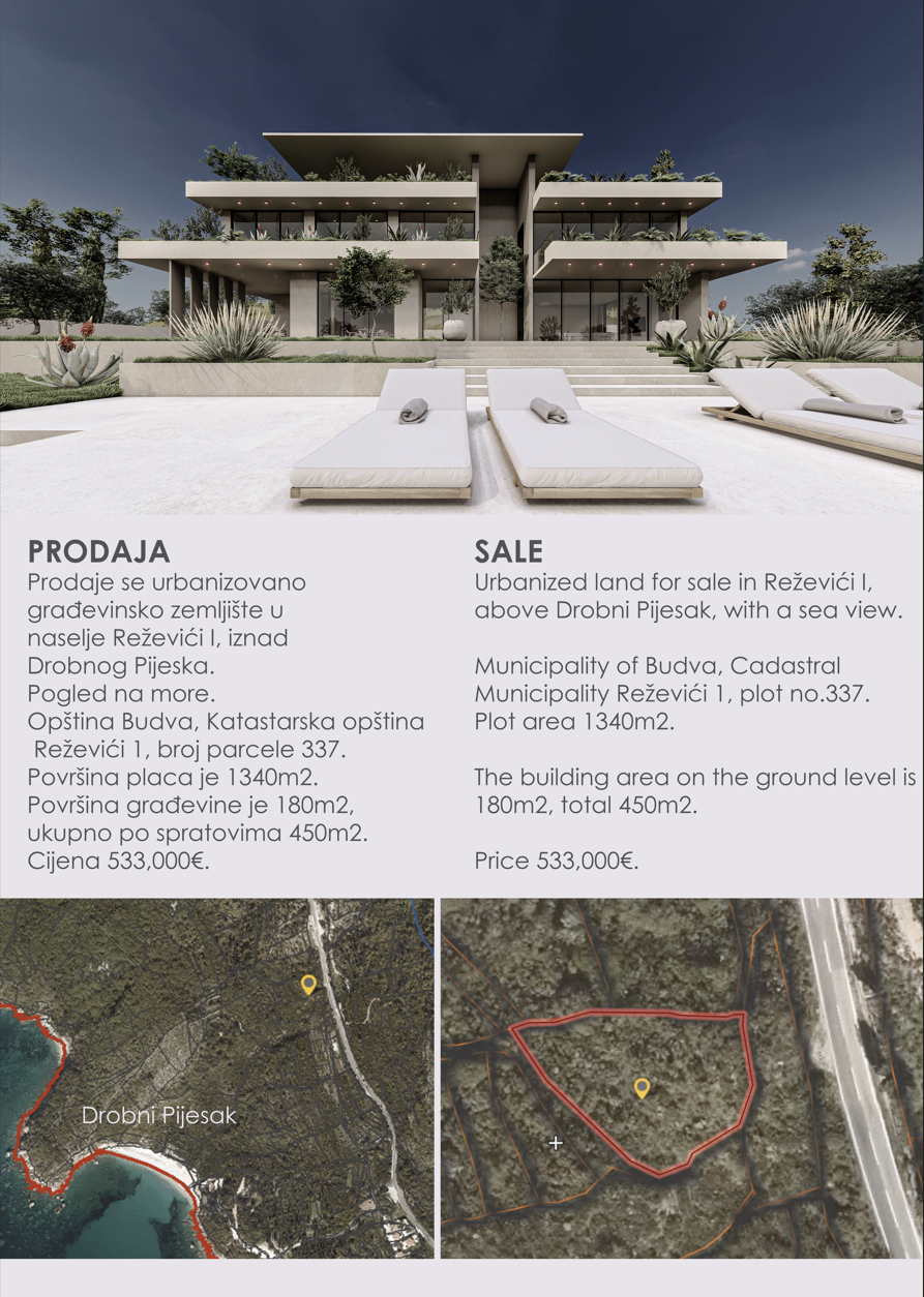 Продается урбанизированный строительный участок в поселке Режевичи I, над Дробным Песком. Вид на море. Муниципалитет Будва, Кадастровая община Режевичи 1, номер участка 337. Площадь участка составляет 1340м2. Площадь здания составляет 180м2, всего по этажам 450м2.