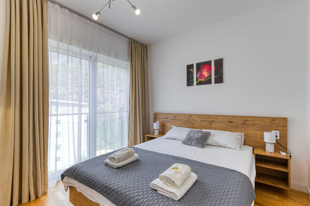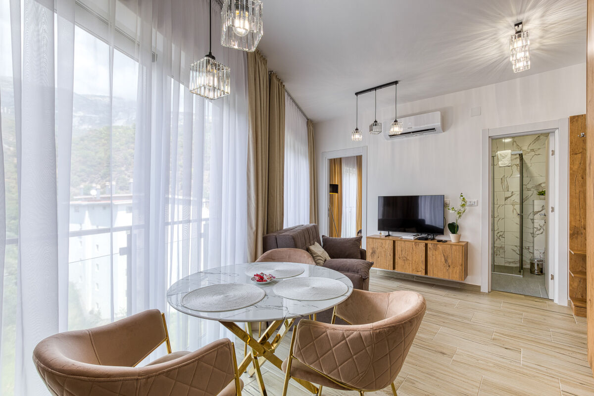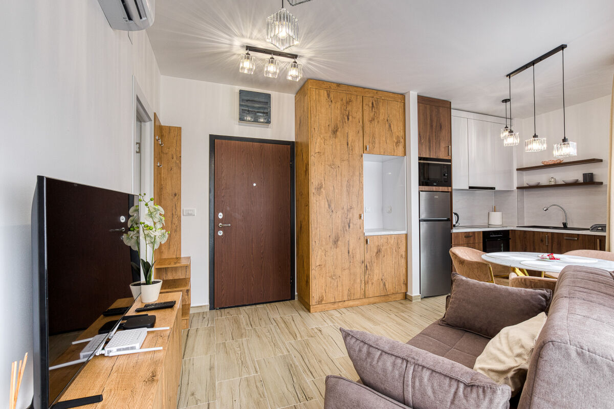 Сдается однокомнатная, современно оборудованная квартира в роскошном комплексе Sunny Side Wellness & Spa Resort в Бечичах. Квартира полностью меблирована и оборудована для комфортного проживания, с современным интерьером, кухней, кондиционером, быстрым интернетом. Жителям доступно полное предложение курорта, включая спа-центр, бассейн, тренажерный зал, а также рецепцию. За дополнительные 150€ в месяц доступна услуга гостиничного обслуживания, которая включает уборку, замену постельного белья и полотенец, что делает эту квартиру идеальной для тех, кто хочет максимального комфорта и беззаботности.