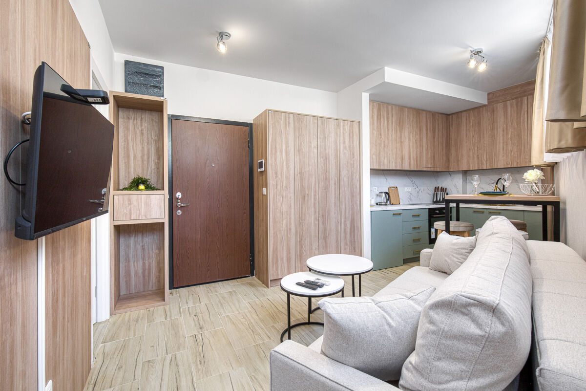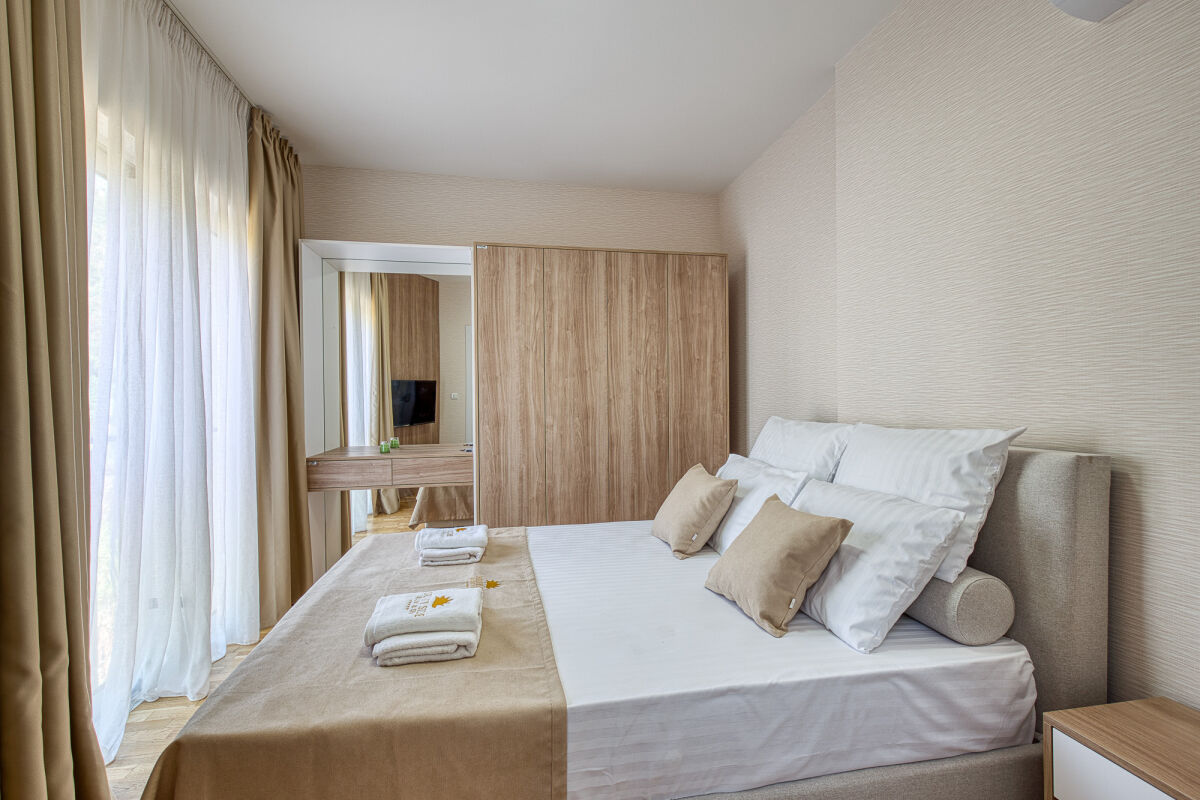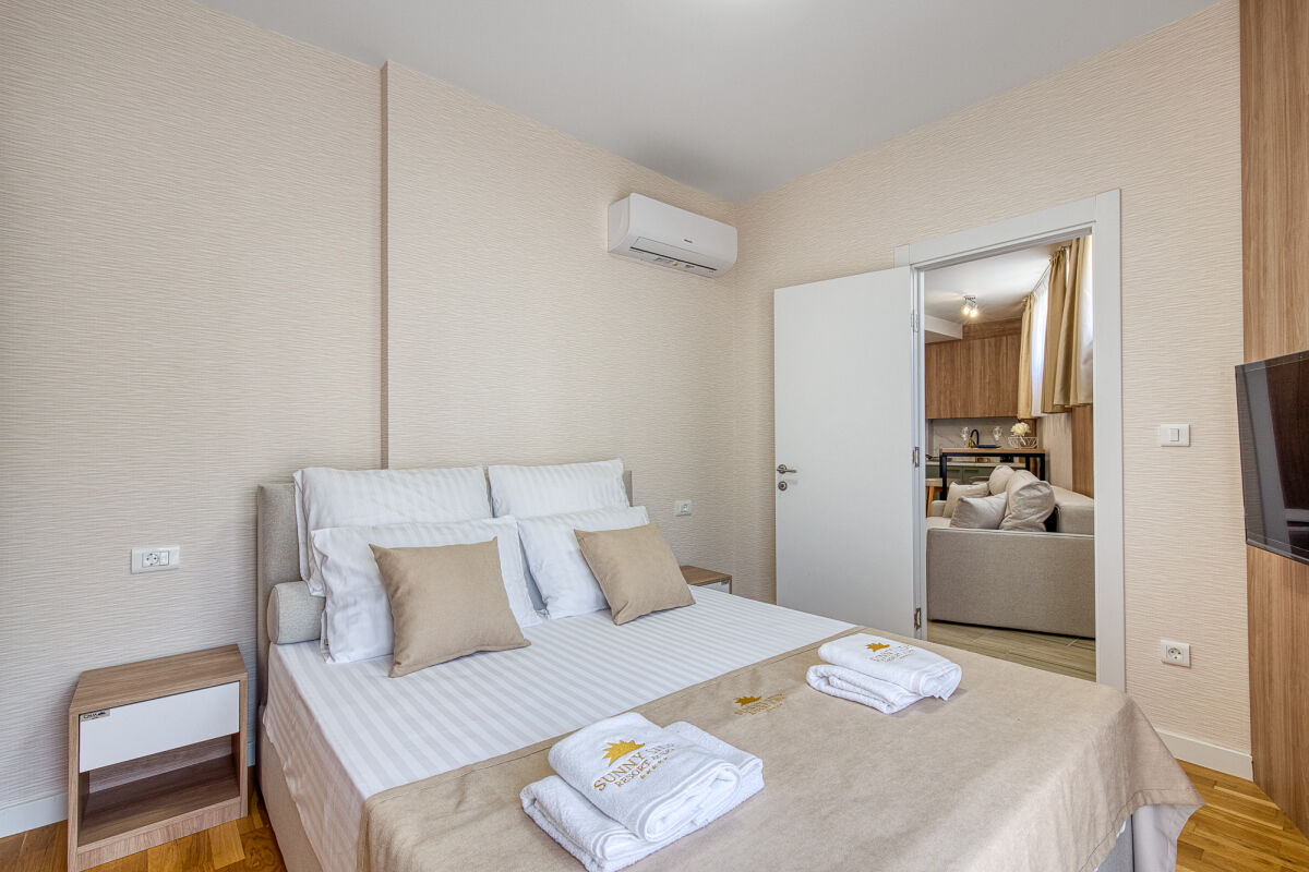 Сдается однокомнатная, современно оборудованная квартира в роскошном комплексе Sunny Side Wellness & Spa Resort в Бечичах. Квартира полностью меблирована и оборудована для комфортного проживания, с современным интерьером, кухней, кондиционером, быстрым интернетом. Жителям доступен полный спектр услуг курорта, включая спа-центр, бассейн, тренажерный зал, а также рецепцию. За дополнительные 150€ в месяц доступна услуга гостиничного обслуживания, которая включает уборку, смену постельного белья и полотенец, что делает эту квартиру идеальной для тех, кто хочет максимального комфорта и беззаботности.