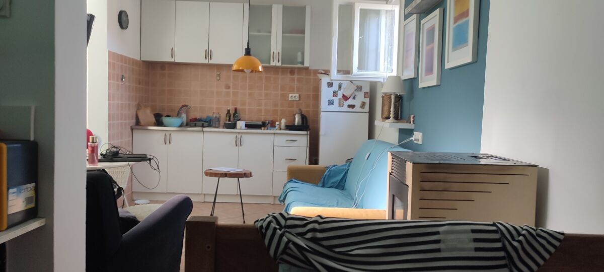 Настроенная квартира площадью 40 м2 с двором. С кондиционером, печь на пеллетах, wfi. Светлая гостиная с кухней, комната и ванная. 1 км от центра города.
