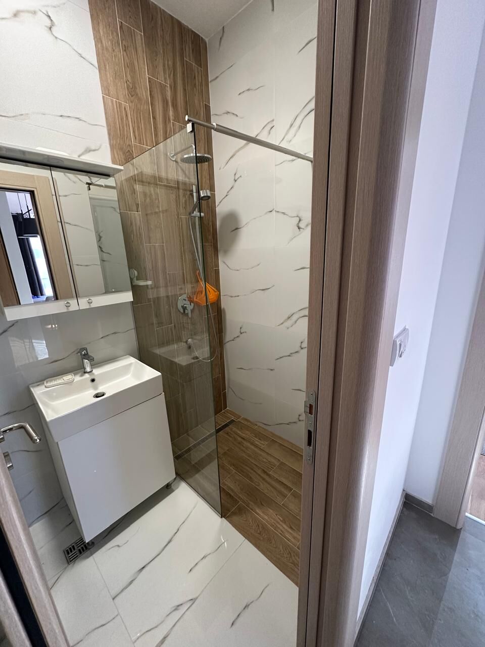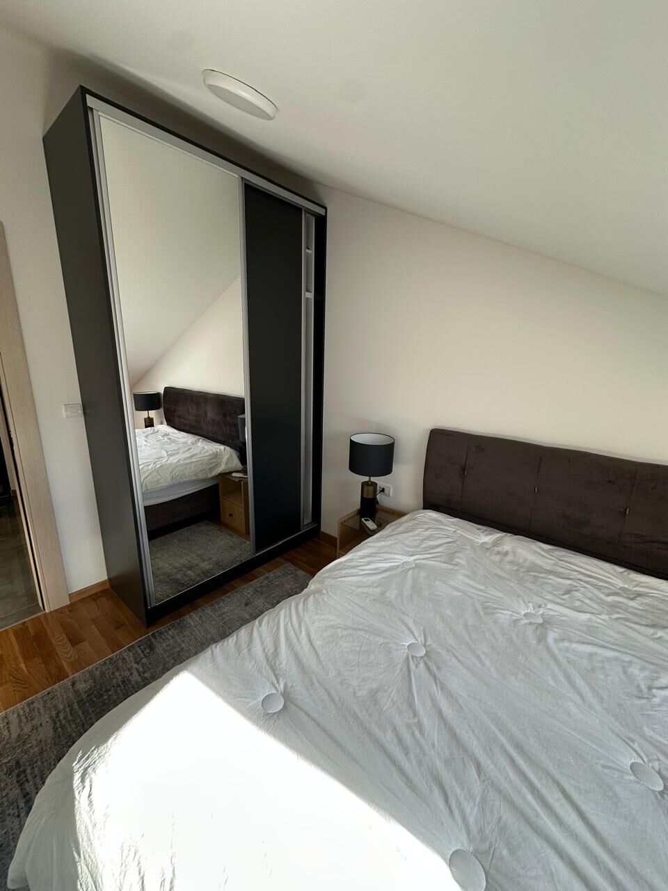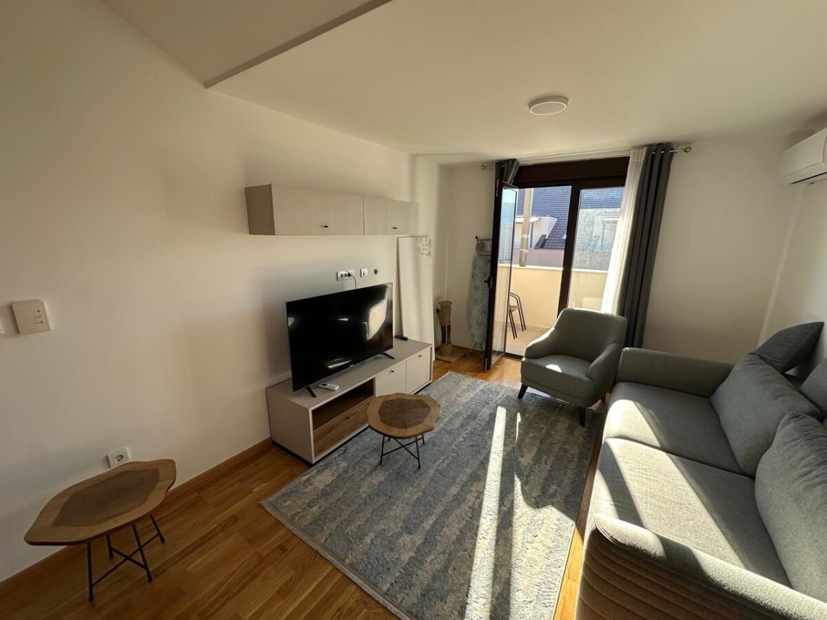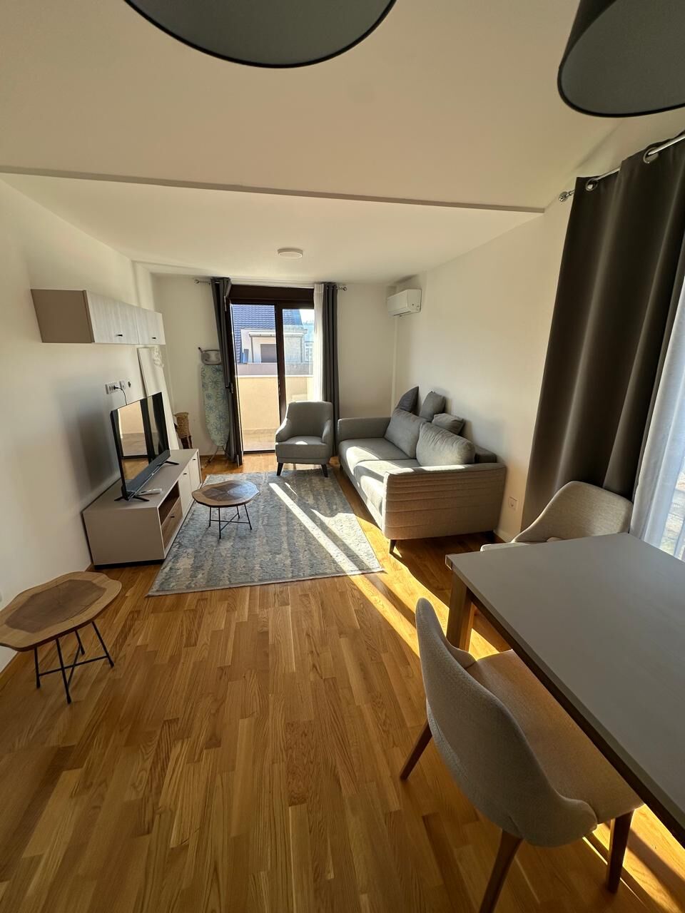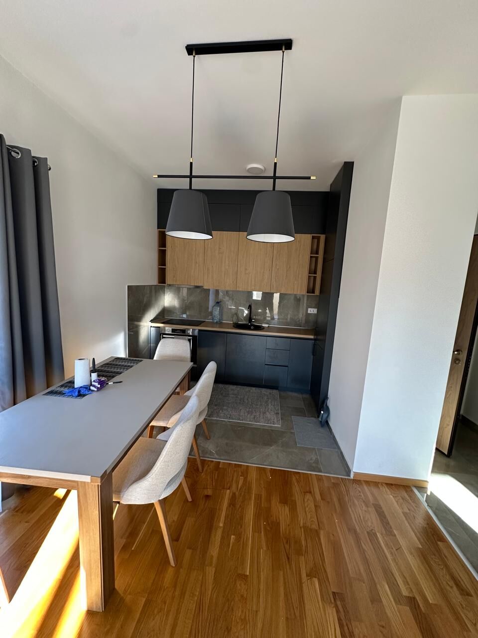 Однокомнатная квартира в аренду на третьем этаже нового здания в Подгорице на Забьело. Квартира площадью 45 квадратных метров и включает одну спальню, гостиную с столовой и кухней, прихожую, ванную комнату и террасу. Квартира полностью оборудована новой, качественной, мебелью на заказ. Квартира сдается вместе с гаражным местом.