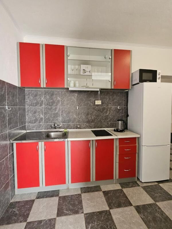 Квартира с 1 спальней и собственной терассой. Приземье, площадь 65м2. Кухня-трапезария, с 2-конфорочной варочной панелью, микроволновкой, электрочайником, холодильником, обеденная зона; отделяется от гостинной с помощью раздвижной двери. Гостинная: раскладной диван (2 спальных места), телевизор; выход на терассу. Совмещенный санузел, стиральная машина. Изолированная спальня с двухспальной кроватью, шкафы для хранения вещей. Здание находится в 600м от пляжа и ресторана ББ. Имеется мощный осушитель воздуха, постельное белье, кухонные принадлежности, пр., интернет - безлимитный Wi-Fi. В шаговой доступности школа, детский сад, частные магазинчики и сетевые - Идея и Арома. При аренде на год: первый месяц + два последних + депозит. Оплата за месяц + коммунальные услуги, парковка и интернет.