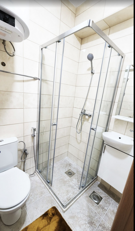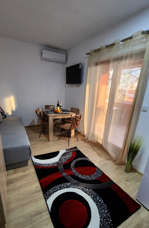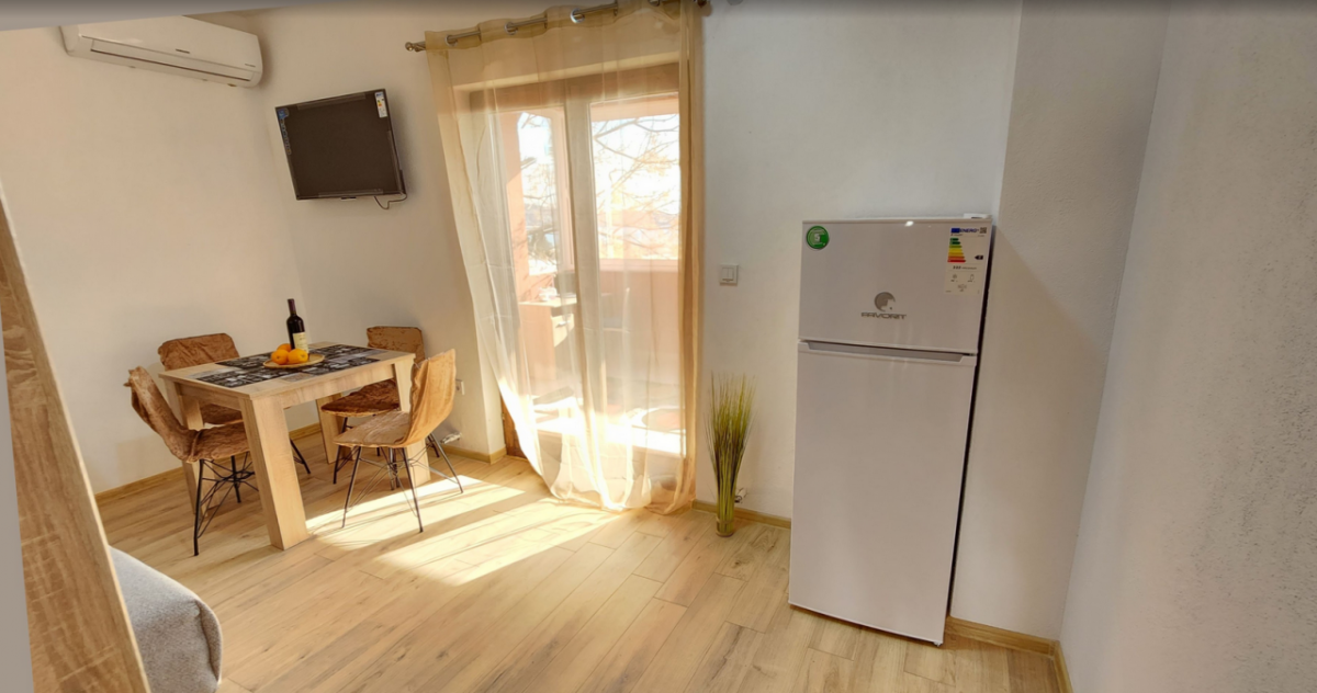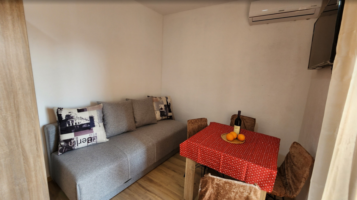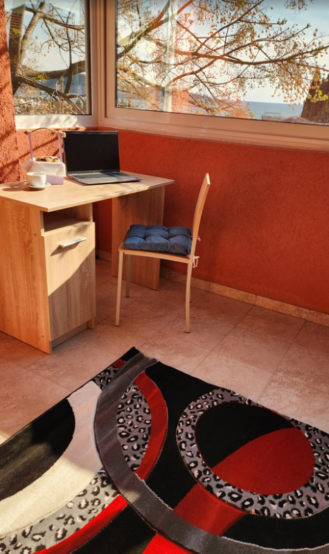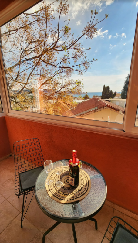 Квартира с одной спальней и застекленной терассой с видом на море. Первый этаж, площадь 55м2. Маленькая проходная кухня с 2-конфорочной варочной панелью, микроволновкой, электрочайником. Совмещенный санузел. Изолированная спальня с двухспальной кроватью; гостинная - диван (2 спальных места), обеденная зона, холодильник; из гостинной - выход на застекленную большую терассу. Застекленная терраса может использоваться в качестве дополнительной спальни, комнаты для отдыха, столовой, либо рабочего кабинета. Здание находится в 600 метрах от пляжа и ресторана ББ. Имеется мощный осушитель воздуха, постельное белье, кухонные принадлежности, пр., интернет - безлимитный Wi-Fi. В шаговой доступности школа, детский сад, частные магазинчики и сетевые - Идея и Арома. Месяц сезон: 800 - июнь, сентябрь, 1000 - июль, август. При аренде на год: первый месяц + два последних + депозит. Оплата за месяц + коммунальные услуги, парковка и интернет.