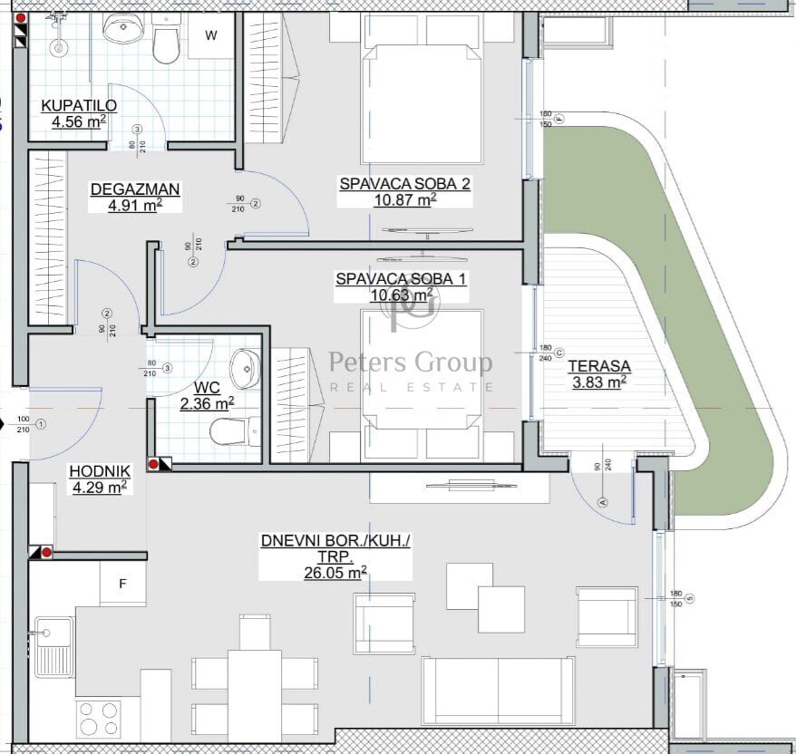 ID – 2485 Na prodaju je dvosoban stan u premijernoj zgradi blizu centra Bara. 4. sprat nove zgrade iz 2024. godine, 500 m do centra, 1200 m do mora. Pogled na predgrađe Starog Bara i planinu Rumija. Površina 69 m². Raspored: hodnik, dnevna soba sa kuhinjom i trpezarijom, terasa 4 m², gostinjski toalet, privatna zona sa garderobnim hodnikom, dve spavaće sobe i velika kupatila. Obrada: plafoni 2,65 m, bela završna obrada, skrivene komunikacije, keramičke pločice u zajedničkim prostorijama, drveni pod u spavaćim sobama, potpuno opremljena kupatila, klima uređaji u svakoj sobi, PVC prozori sa trostrukim brtvljenjem i automatskim roletnama, metalna ulazna vrata. Zajedničke prostorije: prirodni granit, dva lifta (Španija), portir, upravljačka kompanija. Prostrano parkiralište. Cena: 199 800 €.