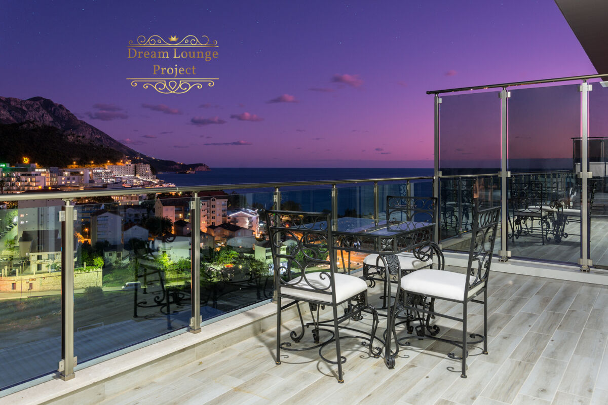 Luksuzni penthaus sa terasom i panoramskim pogledom na more. Lokacija: Becici, Crna Gora Površina: 82 m². 8. sprat, lift. Struktura: - 2 spavaće sobe - Kupatilo sa podnim grejanjem - Dnevna soba sa kuhinjskom zonom Velika terasa (12 m²) sa pogledom na more. Prva spavaća soba sa pogledom na more, druga — na planine. Mogućnost kupovine parking mesta u podzemnoj garaži za 18.000 evra. More — 300 m, u blizini restorani i prodavnice.