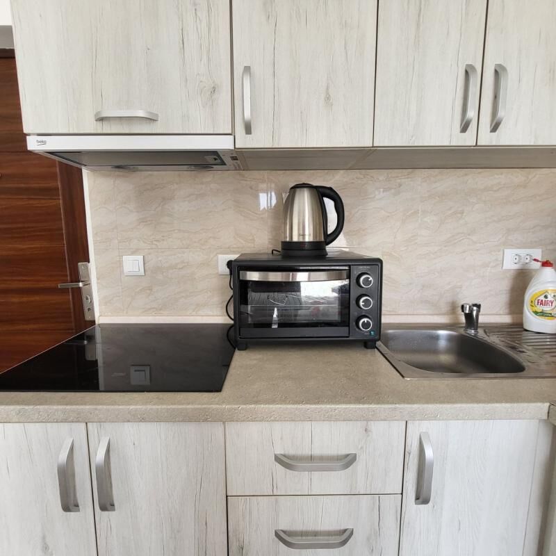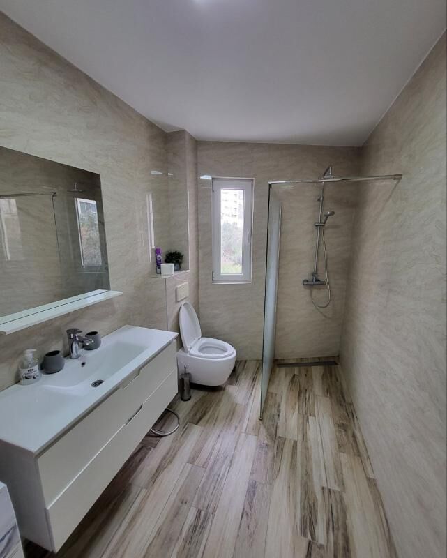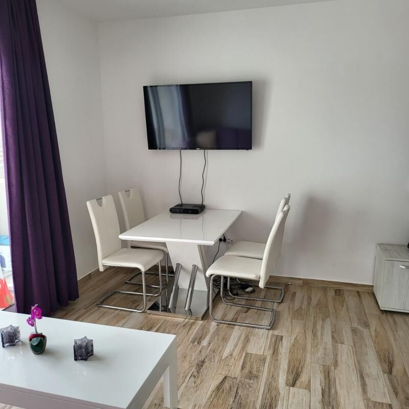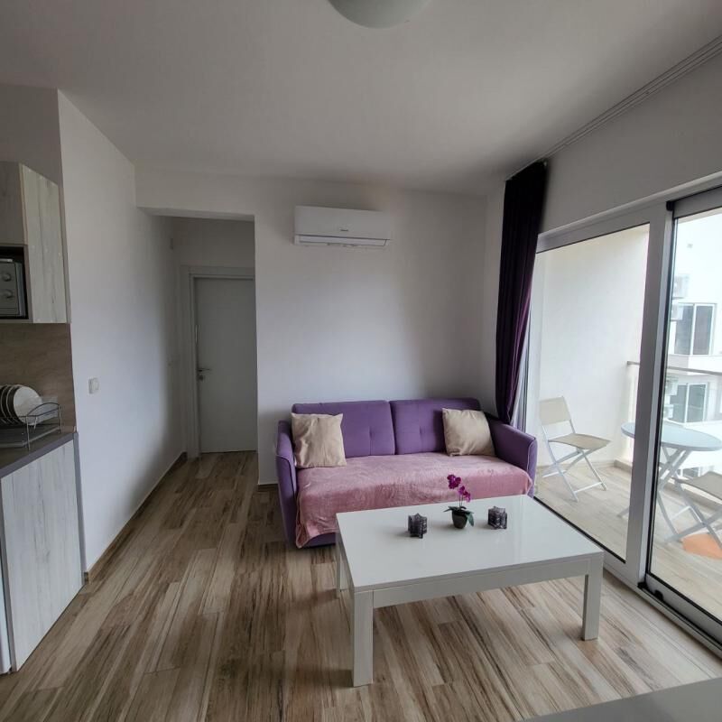 Stan površine 43 m2 na 1. spratu sa pogledom na more i planine. U stanu: 1 spavaća soba, dnevna soba spojena sa kuhinjom, kupatilo, terasa. Stan je potpuno namešten modernim nameštajem i tehnikom (klimatske jedinice u svakoj sobi), podno grejanje. Stan je potpuno spreman za stanovanje. More i obala su u lakoj dostupnosti pešice 400m. Gosti imaju na raspolaganju: otvoreni bazen, hamam, sauna, teretana. Na raspolaganju gostima je recepcija, gde mogu dobiti odgovore na svakodnevna pitanja, rešiti tehničke probleme i organizovati slobodno vreme. Odlična opcija za investicije (iznajmljivanje).