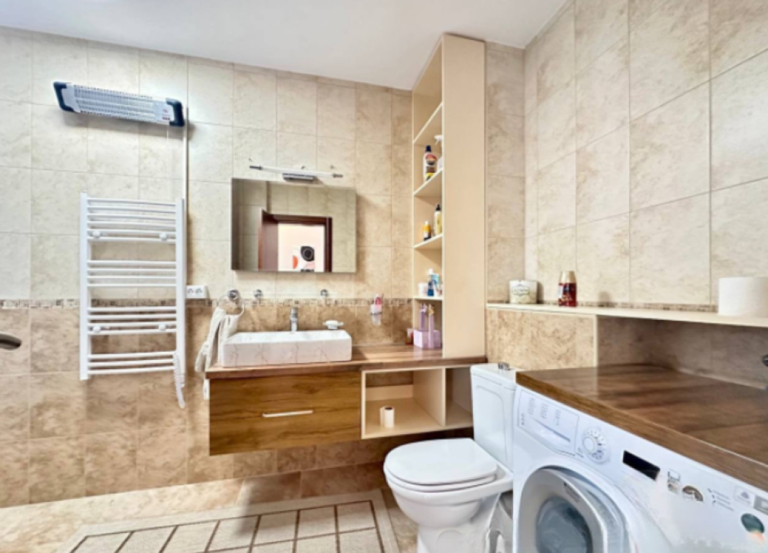 Prostrana svetla stan sa 2 spavaće sobe, dnevnom sobom sa kuhinjom i trpezarijom, 2 kupatila. Stan je suv i udoban za celogodišnje stanovanje. Prostrana terasa sa direktnim pogledom na more. Stan ima praktičan raspored i opremljen je kvalitetnim ekološki čistim materijalima. Klimatizacija u svakoj sobi. Kuhinja je potpuno opremljena. Ima svoje garažno mesto. Na teritoriji zgrade je zelena zona i zona za roštilj; sopstveni garaža. Do mora 900m. U zgradi je upravljačka kompanija. Čisti dokumenti.
