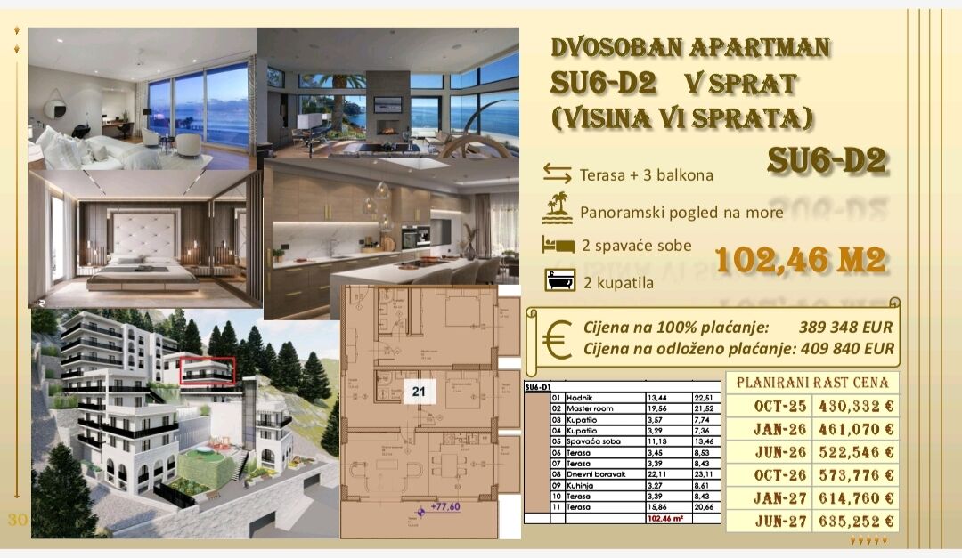 Panoramski pogled more - Dvosoban penthaus SU6-D2, V sprat, visina VI sprata, 102.46 m2, terasa + tri balkona Cena sa popustom za avansno placanje 389.348 eur, Cena za odloženo plaćanje 409.840 eur Montenegrina Residence - Dragulj Budve Objekat se nalazi 7 minuta hoda od autobuske stanice i 15 minuta hoda od plaže, kao i 15 minuta hoda od centra. Sadržaće: recepciju, obezbeđenje 24/7, spa centar sa teretanom, jacuzzi, saunu, spoljni bazen sa grejanjem, sa mogucnošću korišćenja tokom cele godine, pool bar, restoran i igralište za decu, kao šatl prevoz do plaže i avantura park iznad objekta. Garaža se sastoji iz dva nivoa i cena garažnog mesta iznosi 25. 000 eur. Planiran završetak radova: Jun 2027. Nekretninu kupujete direktno od investitora bez troškova agencije. Za zakazivanje obilaska gradilišta i finalne popuste, budite slobodni da nas kontaktirate. Ana Golubović +38268132995 - viber/wapp Ana Vešović +38268079257 - viber/wapp
