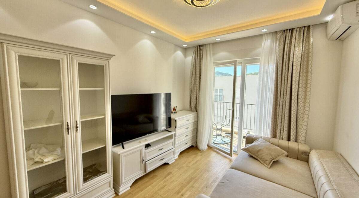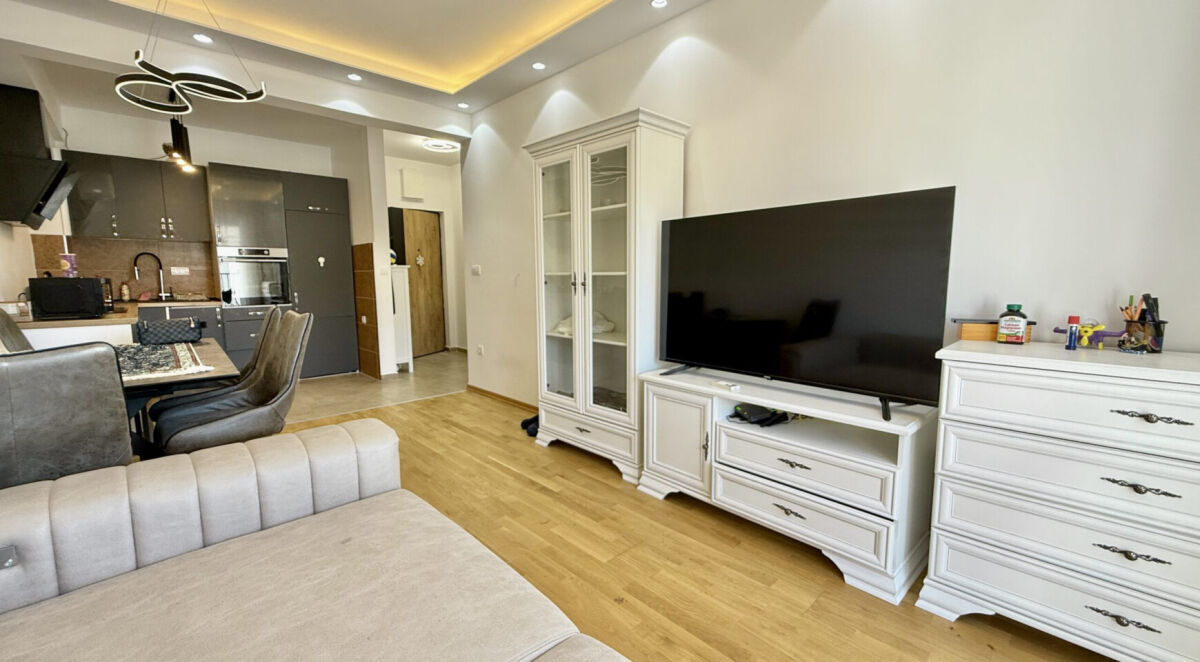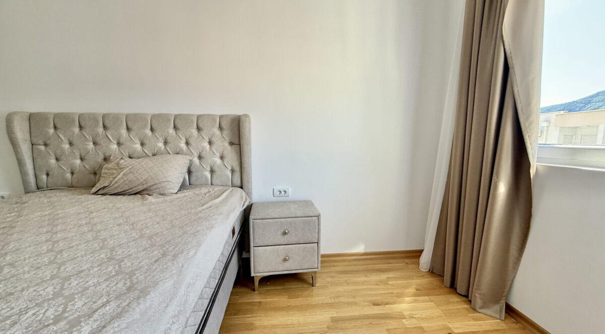 Jednosoban stan, 46 m², 5. sprat, nova zgrada sa liftom. Stan ima novi moderni nameštaj i aparate. Parket na podovima. Pogled na more sa terase. Odlična ponuda za udoban život ili dugoročno ulaganje. Nema dodatnih ulaganja potrebnih!