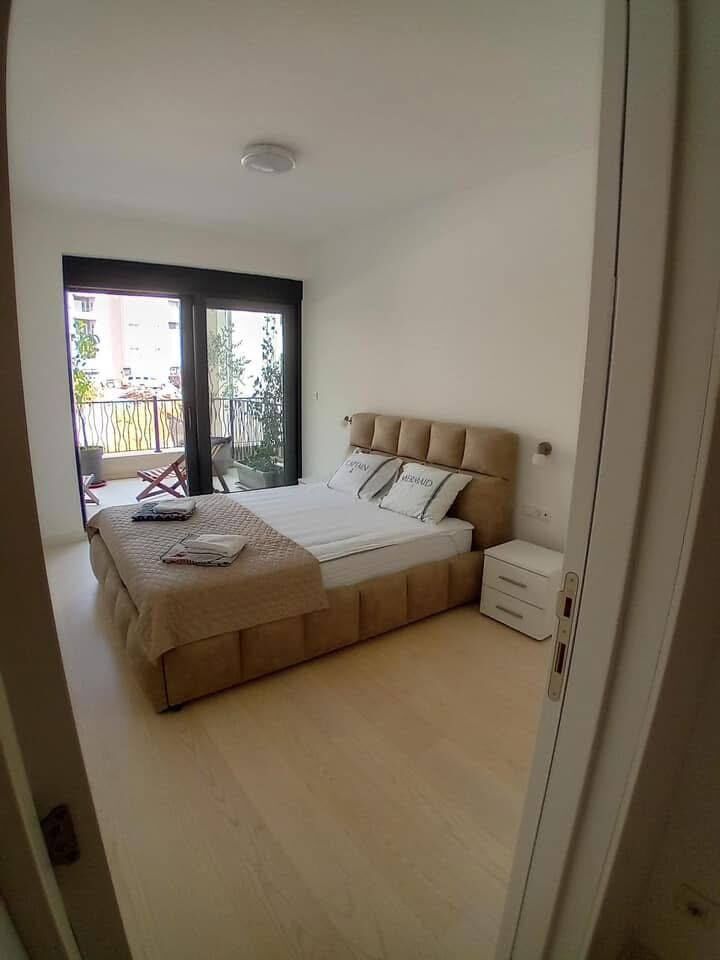 Saradjujemo sa agentima. Stan i garaža. Dubovica, Budva, Crna Gora. Spavaća soba 1. Stambena površina 45 m2 + 12 m2 terasa. Pogled na more. ID199