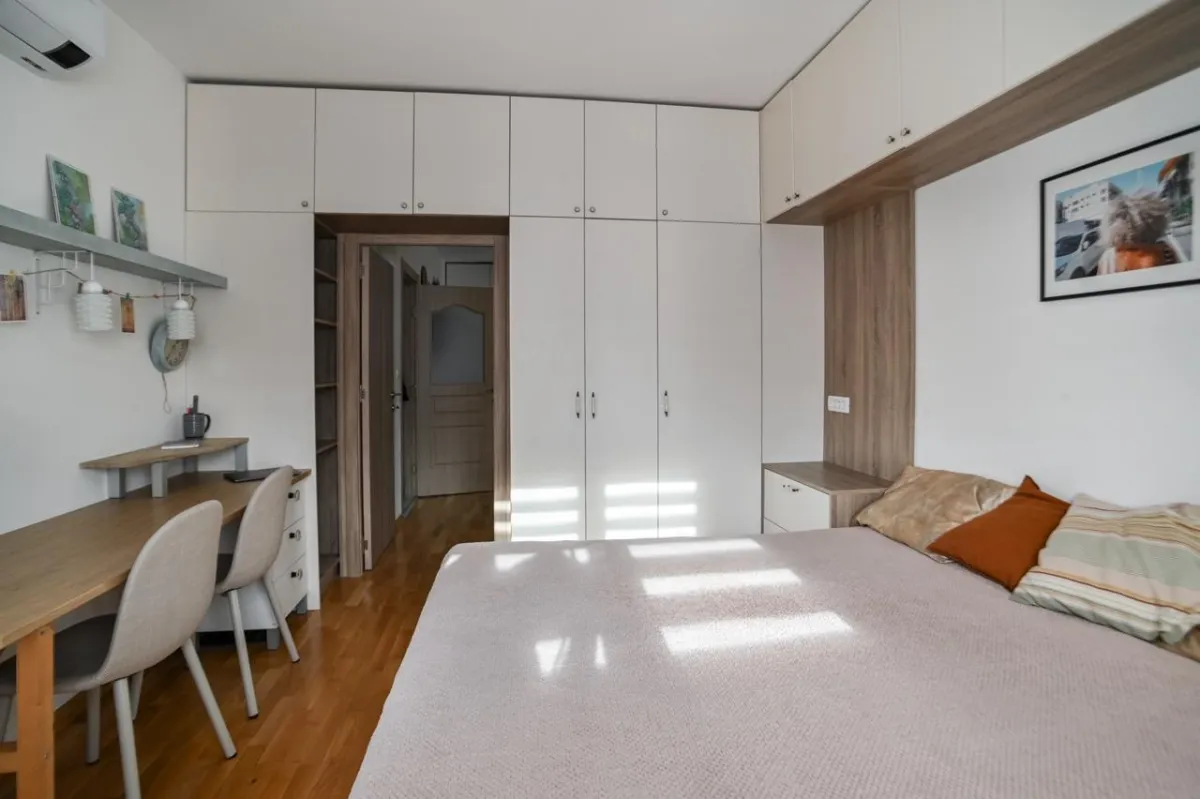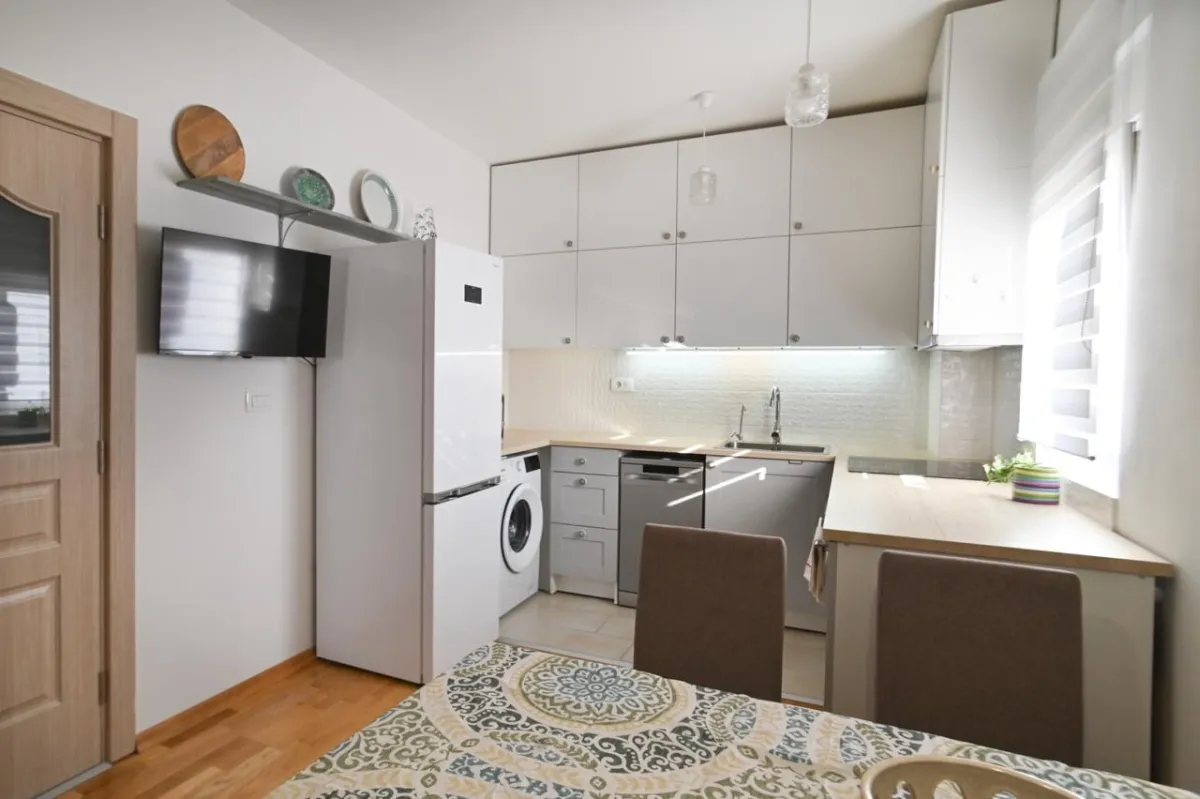 Budva, #7585. Jednosoban stan na prodaju, potpuno namešten. Blizu TehnoMaksa. Sprat 3. 46 m² + 4 m² terasa. Novoizgrađeno. Podzemno garažno mesto dostupno uz doplatu.