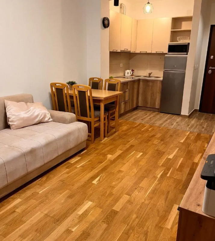 Udoban, suv i topao stan površine 40m2 nalazi se na 2. spratu nove stambene zgrade iz 2021. godine (sa liftom). Stan je potpuno namešten: ugradni ormari su osmišljeni tako da ne zauzimaju koristan prostor, na podu je parket. Raspored: 1 prostrana spavaća soba sa mogućnošću organizacije radnog mesta, dnevna soba sa kuhinjom, terasa sa nadstrešnicom i pogledom na mirno dvorište i planine, izlaz na terasu iz obe sobe. U stanu: klima uređaj, bojler, mašina za pranje veša, frižider. Lokacija: 450 m do mora kroz park, 2 minuta peške do Slovenska Plaža, supermarketa MEGA. U zgradi je predviđena garaža, parking mesto se kupuje posebno. Stan je odličan kako za komforan život, tako i za sezonski najam. Drugi sprat je pogodan za porodice sa decom i starije osobe.