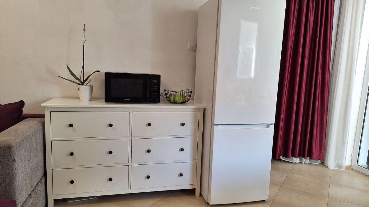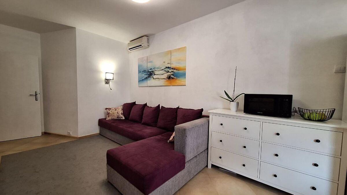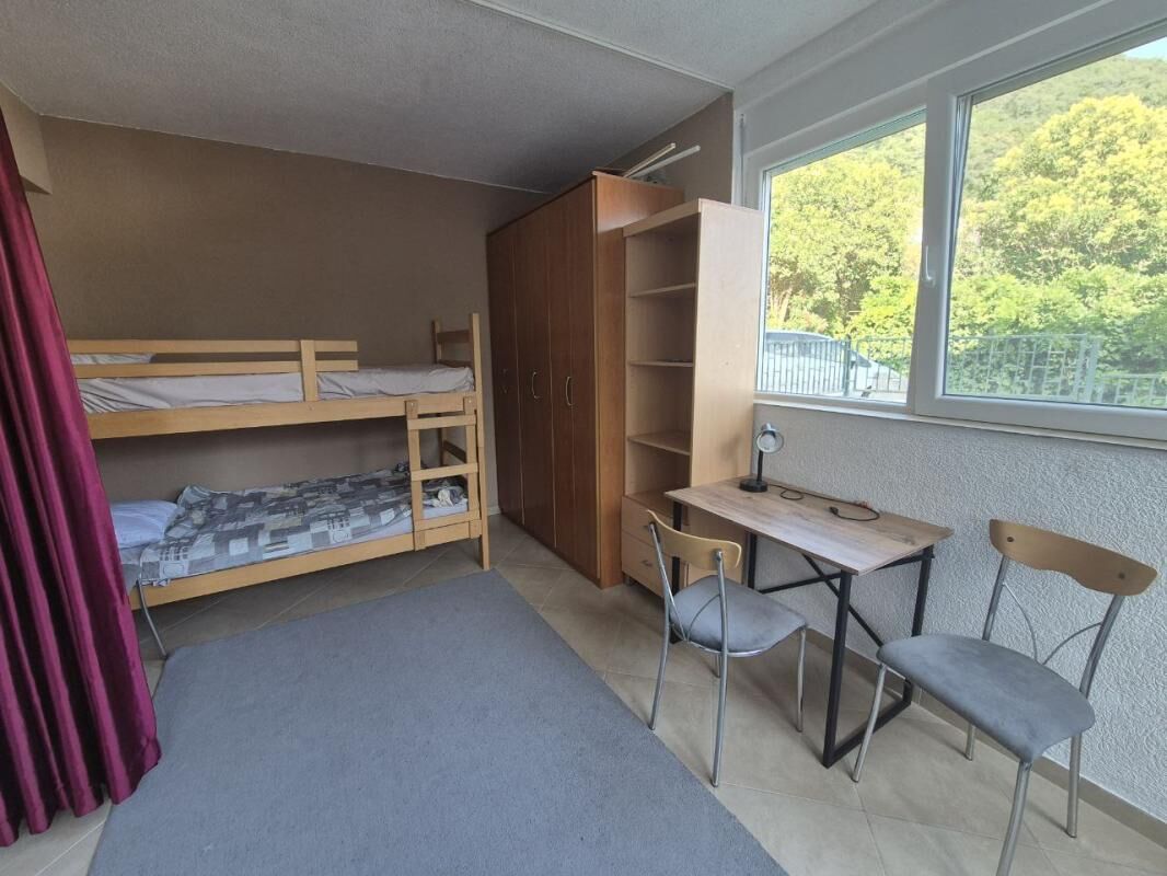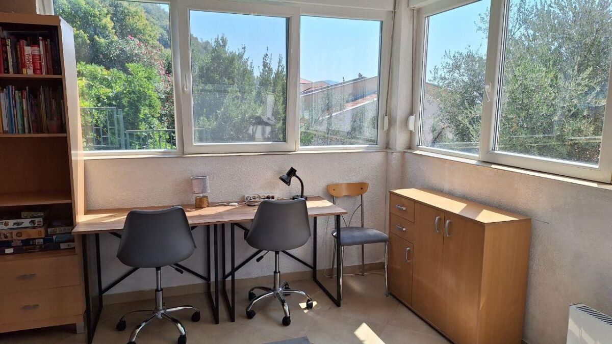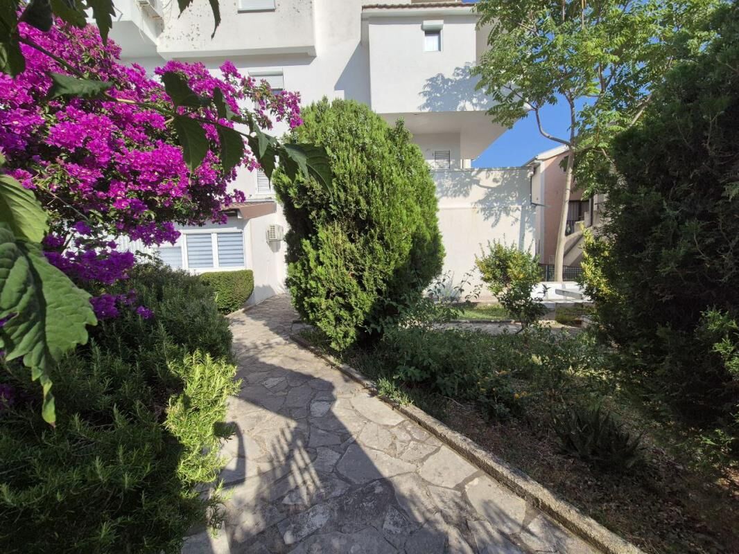 Udoban stan sa 2 spavaće sobe nalazi se na 1. crnogorskom spratu (2. sprat) u četvorospratnoj zgradi. Praktičan hodnik sa ormarom za odlaganje stvari, dnevna soba sa velikim rasklopivim kaučem i klima uređajem, nova kuhinja sa mašinom za pranje sudova, garderober ili radna zona, jedna spavaća soba sa bračnim krevetom i ormarom, druga spavaća soba sa krevetom na sprat, radnim stolom i ormarom. Pogled na mirno zeleno dvorište i mali pogled na more. Ukupna površina 60m2 (37 m2 + zatvorena terasa, preuređena u posebnu spavaću sobu). Udaljenost do mora sa peščanom plažom - 650 metara. Do autobuske stanice 2 minuta pešice. Prodavnice, restorani, kafići, pekare - na 5-7 minuta pešice. Zatvoreno zeleno dvorište sa prostorom za odmor. Javni parking pored zgrade (mesta uvek ima). Dobar potencijal za iznajmljivanje.