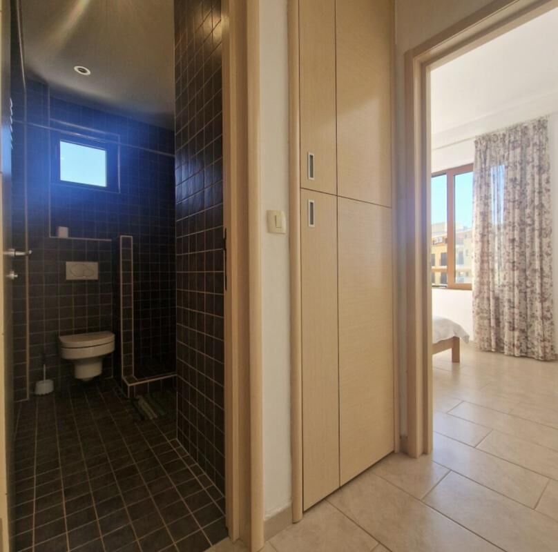 Prostrana i svetla stan površine 57 m², smešten u mirnom području pored mora. Sa terase se pruža prelep panoramski pogled na more. Garaža je uključena u cenu. Ostava. Raspored: Kuhinja Dnevna soba Dve spavaće sobe Kupatilo Terasa sa pogledom na more Stan je idealan za stalno stanovanje ili kao investicija za izdavanje.
