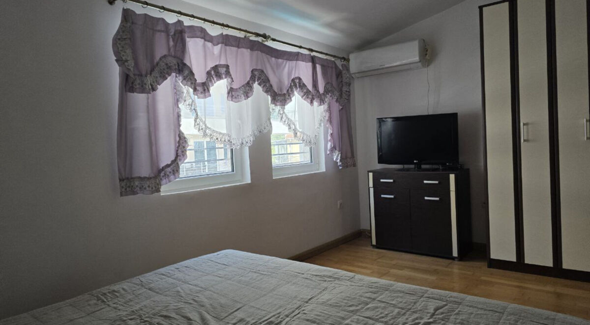 Stan sa pogledom na more na prodaju. Nalazi se na petom spratu zgrade od pet spratova bez lifta. Udaljenost do mora je 450 metara, a ukupna površina stana je 74 kvadratna metra. Stan se sastoji od dve spavaće sobe, kupatila i terase sa staklenim zidovima i kliznim prozorima. Visoki, kosi plafoni. Klima uređaj u svakoj sobi. Parket. Stan je potpuno namešten i spreman za useljenje. Odličan potencijal za iznajmljivanje. Prijava za boravišnu dozvolu. Besplatan parking ispred zgrade. Čisti dokumenti. Plaćanje se može izvršiti na bankovni račun u Crnoj Gori; plaćanje u Rusiji je takođe moguće.