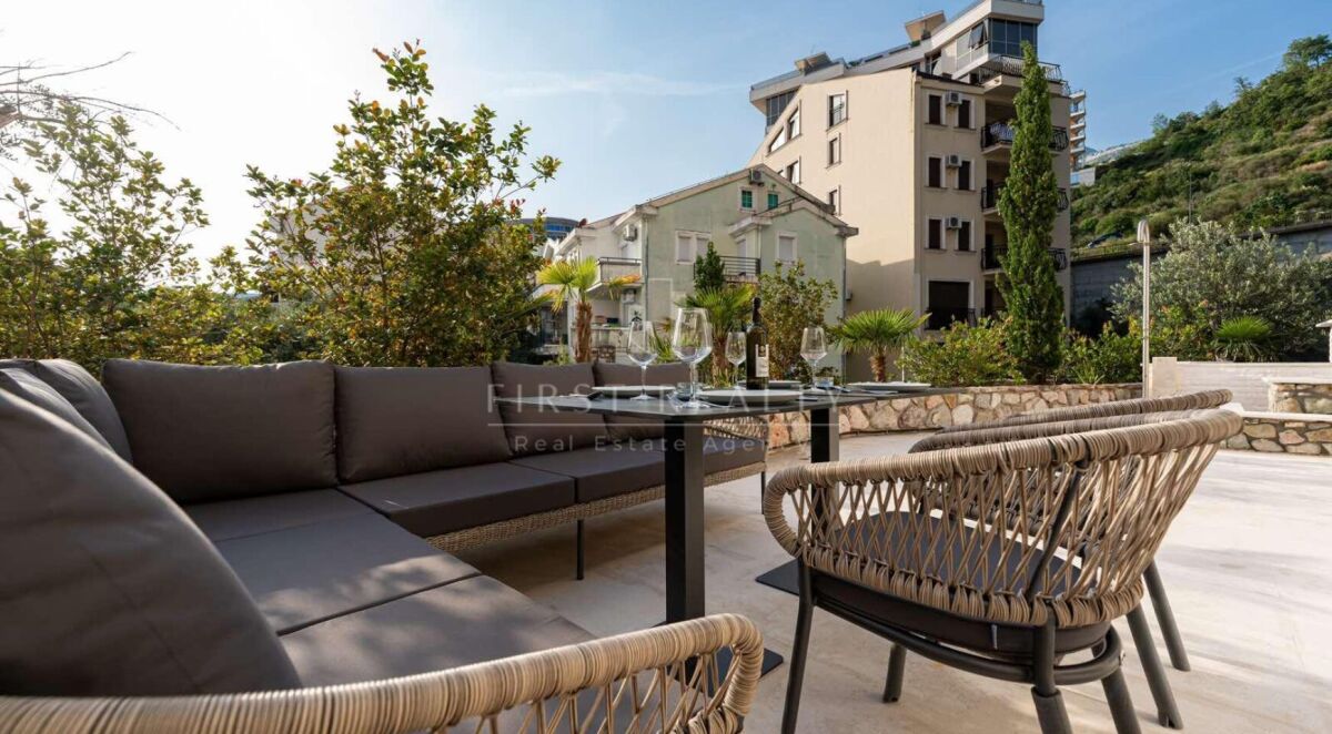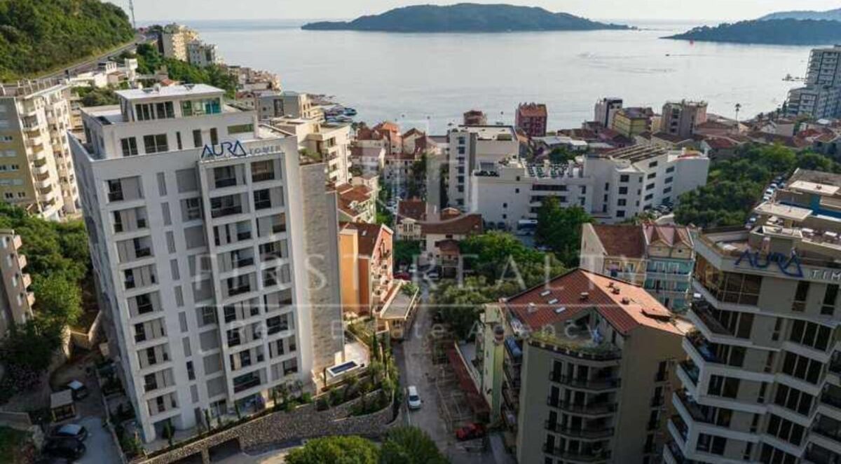 Ekskluzivni stan na prodaju u Rafailovićima. Stambena površina stana je 56 m2 plus ogromna terasa. Nekretnina se nalazi u prizemlju i ima pristup velikoj spoljašnjoj terasi. Terasa od 80 m2 je u ekskluzivnoj upotrebi vlasnika ovog stana (i biće preneta budućem vlasniku pod istim uslovima). Terasa je opremljena prostorom za opuštanje, tu je ekskluzivni masažni jacuzzi (12 masažnih režima, kapacitet – 8 osoba, – cena 30.000 evra), kao i spoljašnja tuš kabina i kupka. Stan je potpuno opremljen nameštajem i aparatima od najboljih svetskih proizvođača. Podno grejanje. Klimatizacija. Nekretnina se nalazi 250 metara od mora, u jednoj od najboljih novih zgrada na Budvanskoj rivijeri – AURA kula – (Pashtrovska ulica). U zgradi se nalazi upravljačka kompanija, recepcija, kafeterija, 3 lifta, tro nivoa podzemne garaže. Dva parking mesta u garaži su uključena u cenu.
