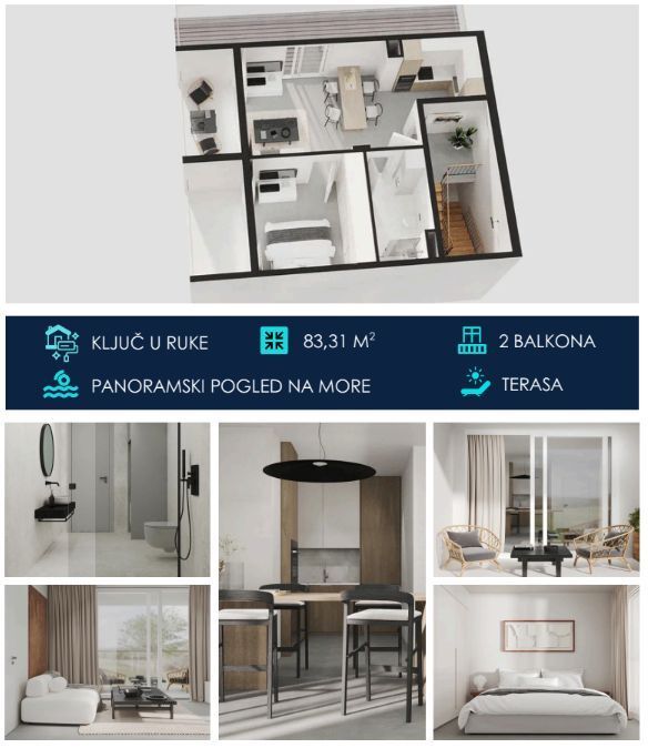 Predstavljamo vam moderan jednosoban apartman površine 83.31m², smešten u novom stambenom kompleksu na atraktivnoj lokaciji u Tivtu, sa prelepim pogledom na more. Na prodaju ekskluzivni stanovi u novom stambenom kompleksu smeštenom u zelenilom okruženom i mirnom naselju Bonići, Tivat. Ovaj kompleks pruža izvanredno životno iskustvo na samoj obali Bokokotorskog zaliva – jednog od najlepših mesta na crnogorskom primorju. - Svaki stan ima panoramski pogled na more - Zatvorena rezidencijalna zajednica (gated community) - Privatni direktan pristup plaži iz kompleksa - Privatni vez za brodove - Veliki bazen - Dečje igralište i sportski teren - Concierge servis - Zajednička zona za relaksaciju u borovoj šumi Stanovi se prodaju po principu „ključ u ruke“, sa vrhunskim završnim materijalima – uključujući prirodni kamen za fasade i javne površine, panoramsko ostakljenje za dosta prirodnog svetla, klimatizaciju i savremenu sanitariju. Svaki detalj je pažljivo osmišljen da pruži udobnost i luksuz savremenog života. Kompleks se nalazi u Tivtu, samo nekoliko minuta od Porto Montenegra, ali u mirnom i tihom delu idealnom za porodični život, odmor ili investiranje. U slučaju izdavanja, očekivani period povrata investicije je oko 10 godina – odlična prilika za one koji žele sigurnu i luksuznu nekretninu na moru sa visokim potencijalom prinosa.