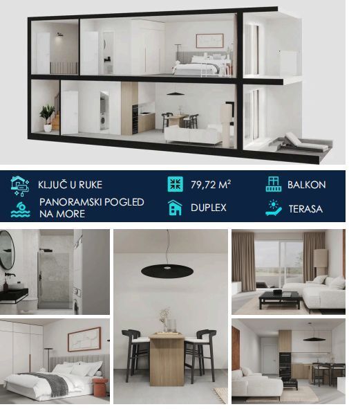Predstavljamo vam moderan dupleks apartman površine 79.72 m², smešten u novom stambenom kompleksu na atraktivnoj lokaciji u Tivtu, sa prelepim pogledom na more. Na prvom nivou nalazi se prostrani dnevni boravak sa kuhinjom i trpezarijom, terasa sa pogledom, kao i moderno kupatilo. Drugi nivo je rezervisan za mirnu zonu — prostranu spavaću sobu, dodatno kupatilo i terasu koja pruža panoramski pogled na more i okolinu. Na prodaju ekskluzivni stanovi u novom stambenom kompleksu smeštenom u zelenilom okruženom i mirnom naselju Bonići, Tivat. Ovaj kompleks pruža izvanredno životno iskustvo na samoj obali Bokokotorskog zaliva – jednog od najlepših mesta na crnogorskom primorju. - Svaki stan ima panoramski pogled na more - Zatvorena rezidencijalna zajednica (gated community) - Privatni direktan pristup plaži iz kompleksa - Privatni vez za brodove - Veliki bazen - Dečje igralište i sportski teren - Concierge servis - Zajednička zona za relaksaciju u borovoj šumi Stanovi se prodaju po principu „ključ u ruke“, sa vrhunskim završnim materijalima – uključujući prirodni kamen za fasade i javne površine, panoramsko ostakljenje za dosta prirodnog svetla, klimatizaciju i savremenu sanitariju. Svaki detalj je pažljivo osmišljen da pruži udobnost i luksuz savremenog života. Kompleks se nalazi u Tivtu, samo nekoliko minuta od Porto Montenegra, ali u mirnom i tihom delu idealnom za porodični život, odmor ili investiranje. U slučaju izdavanja, očekivani period povrata investicije je oko 10 godina – odlična prilika za one koji žele sigurnu i luksuznu nekretninu na moru sa visokim potencijalom prinosa.