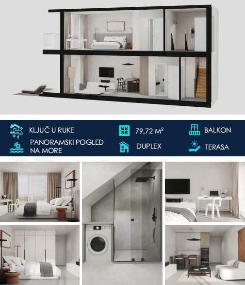 Predstavljamo vam moderan dupleks apartman površine 79.72 m², smešten u novom stambenom kompleksu na atraktivnoj lokaciji u Tivtu, sa prelepim pogledom na more. Na prvom nivou nalazi se prostrani dnevni boravak sa kuhinjom i trpezarijom, terasa sa pogledom, kao i moderno kupatilo. Drugi nivo je rezervisan za mirnu zonu — prostranu spavaću sobu, dodatno kupatilo i terasu koja pruža panoramski pogled na more i okolinu. Na prodaju ekskluzivni stanovi u novom stambenom kompleksu smeštenom u zelenilom okruženom i mirnom naselju Bonići, Tivat. Ovaj kompleks pruža izvanredno životno iskustvo na samoj obali Bokokotorskog zaliva – jednog od najlepših mesta na crnogorskom primorju. - Svaki stan ima panoramski pogled na more - Zatvorena rezidencijalna zajednica (gated community) - Privatni direktan pristup plaži iz kompleksa - Privatni vez za brodove - Veliki bazen - Dečje igralište i sportski teren - Concierge servis - Zajednička zona za relaksaciju u borovoj šumi Stanovi se prodaju po principu „ključ u ruke“, sa vrhunskim završnim materijalima – uključujući prirodni kamen za fasade i javne površine, panoramsko ostakljenje za dosta prirodnog svetla, klimatizaciju i savremenu sanitariju. Svaki detalj je pažljivo osmišljen da pruži udobnost i luksuz savremenog života. Kompleks se nalazi u Tivtu, samo nekoliko minuta od Porto Montenegra, ali u mirnom i tihom delu idealnom za porodični život, odmor ili investiranje. U slučaju izdavanja, očekivani period povrata investicije je oko 10 godina – odlična prilika za one koji žele sigurnu i luksuznu nekretninu na moru sa visokim potencijalom prinosa.