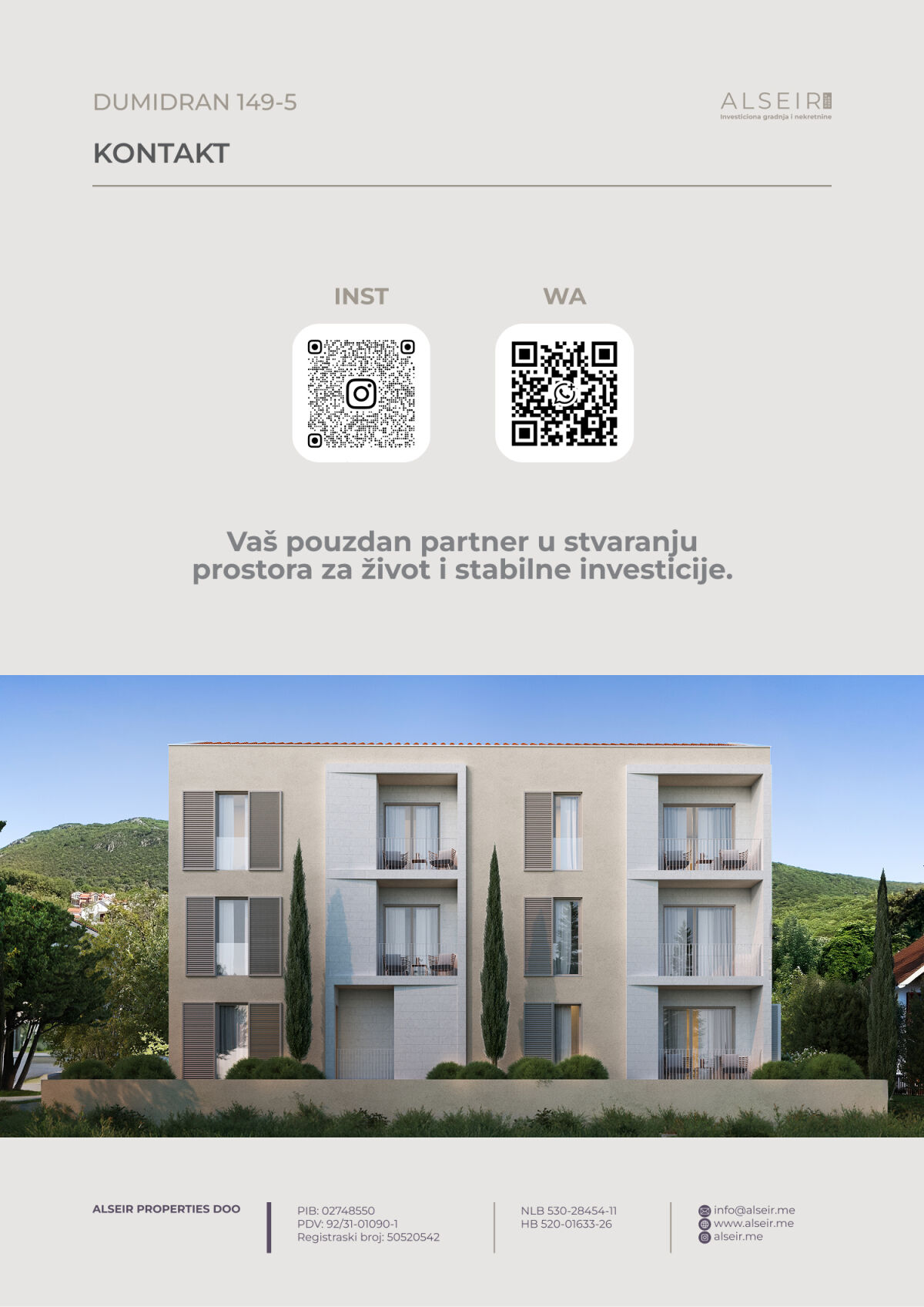 Investitor prodaje jednosoban stan u Tivtu u novom stambenom projektu Dumidran 149-5. Stan se nalazi na 1. spratu i ima ukupnu površinu 48,2 m2.Struktura stana obuhvata dnevni boravak sa kuhinjom i trpezarijom, spavaću sobu,kupatilo i terasu. Prostor je pažljivo projektovan za svakodnevni komfor i funkcionalno korišćenje svakog kvadratnog metra.U stanu je predviđeno podno grijanje u kupatilu i hodniku, kao i multi-split sistem grijanja i hlađenja,a u izgradnji se koriste kvalitetni materijali i savremena tehnička rješenja.Zgrada ima lift i zajedničke prostorije za bicikle, dječija kolica i opremu.Uz stan je uključeno parking mjesto Lokacija ima dobru saobraćajnu povezanost i omogućava brz i jednostavan pristup centru Tivta,plažama (oko 600 m) i Tivatskom bulevaru (oko 250 m).Kupovina je direktno od investitora, bez poreza na promet nepokretnosti (3%).Planirani završetak radova je sredina 2027. godine. Pošaljite upit i ostvarite najbolje uslove kupovine. Kontakt telefon +382 67 023547