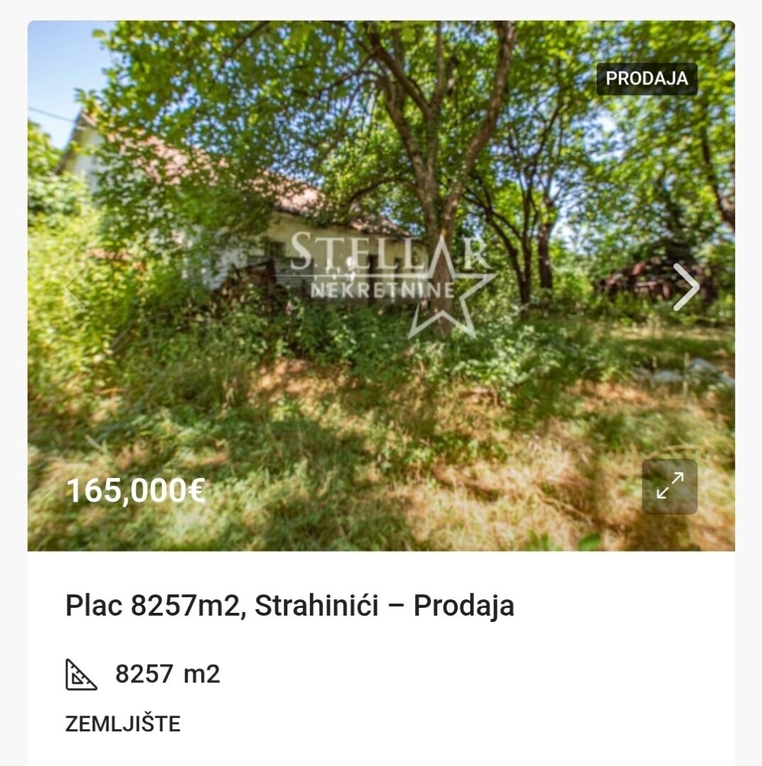 Prodaje se zemljište u selu Strahinići, u Danilovgradu. Površina zemljišta je 8257m2, a cijena od 25e/m2 je trenutno najpovoljnija u širem krugu. Plac ima pad na dvije strane, pa se ne mogu desiti poplave. Plac nije moguže parčati zog svog oblika. Na placu se vec nalazi stara kuća, trenutno neupotrebljiva, ali je sa dozvolom i jedan pomoćno objekat takođe bez tereta i opterećenja. ID nekretnine M665 +382 69 618 445