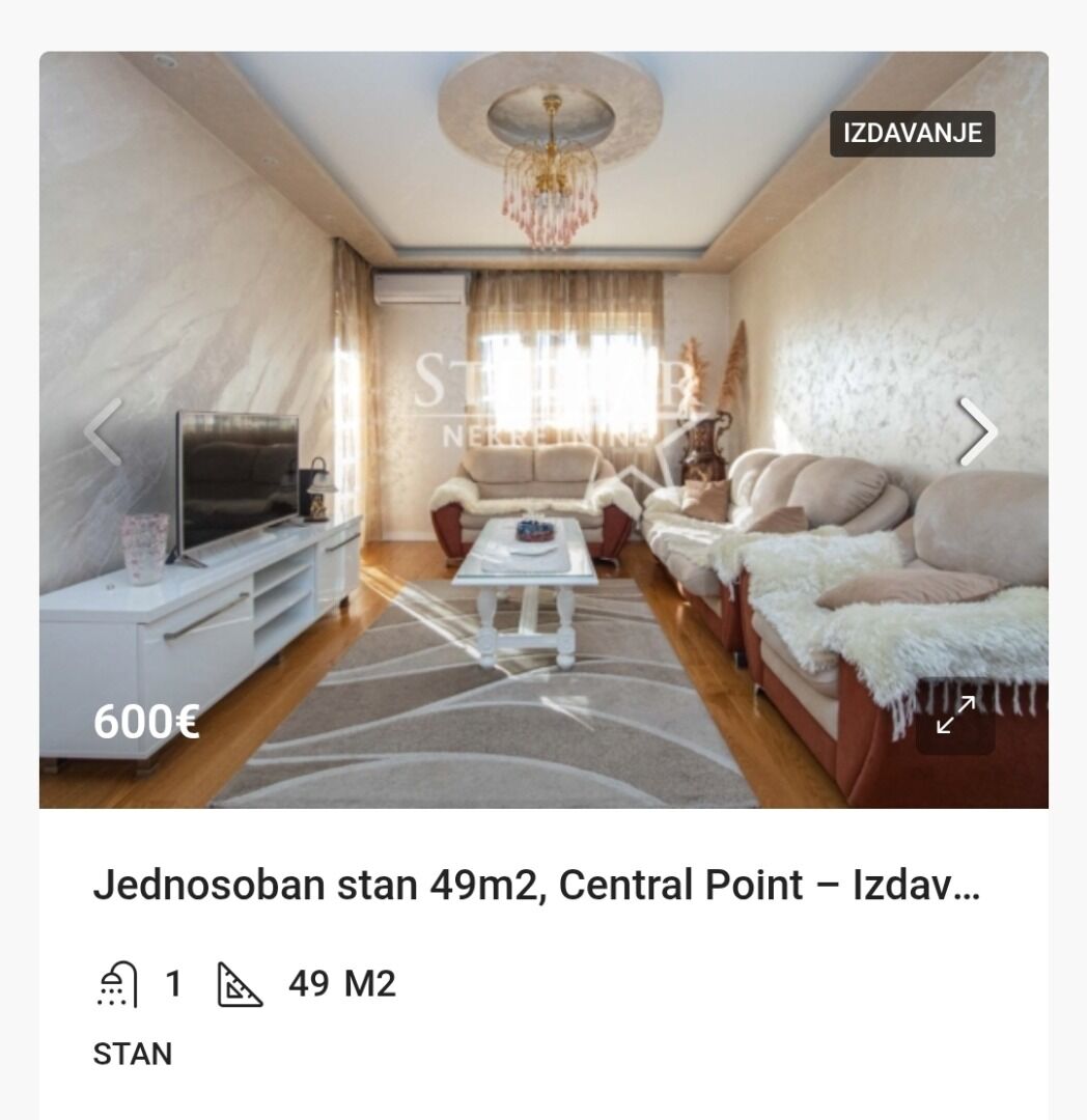 Izdaje se jednosoban stan u Central point-u. Površina stana je 49m2. Stan se nalazi na prvom spratu i potpuno je opremljen. U stanu se nalazi sve što je potrebno za normalan život. U sobi je francuski krevet, a balkon je južne orijentacije i gleda na tržni centar Big fashion. Osim što je tržni centar prvi komšija, lokacija stana je veoma povoljna za sve one koji žele urban život u blizini mnogih ugostiteljskih i uslužnih objekata, bolnice, poliklinika, butika i još mnogo toga ID nekretnine M697 +382 69 6184 445