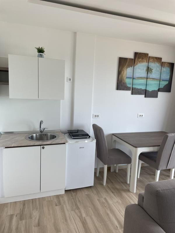 Stan u novoj savremenoj zgradi na 7. spratu (lift). Površina 55m2: 1 spavaća soba, dnevna soba sa kuhinjom, kupatilo, 2 terase. Pogled na more, do plaže 100m. U dnevnoj sobi: rasklopivi nameštaj, televizor; u svakoj sobi: klima uređaj, velika klizna vrata/prozori; frižider, mala električna ploča; u spavaćoj sobi bračni krevet, radni prostor; kupatilo: tuš kabina, veliki bojler, veš mašina. Bez životinja. U blizini sve potrebno: pošta 200m, prodavnica 400m, autobuska stanica, pijaca. Parking. Plaćanje mesečno + komunalne usluge.