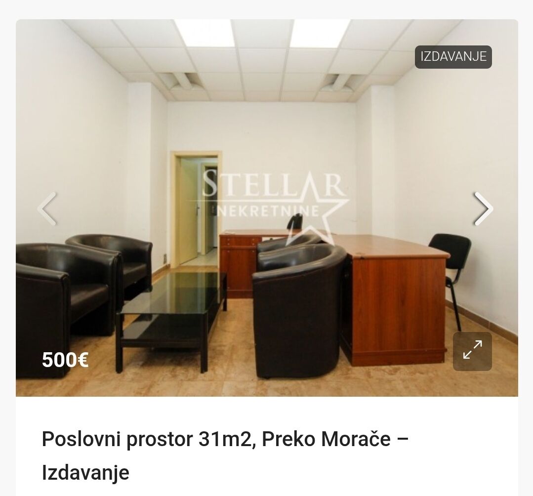 Izdaje se poslovni prostor u neselju Preko Morače. Površina prostora je 31m2. Sadrži glavnu prostoriju za obavljanje djelatnosti, mali hodnik, kuhinju i toalet. Prostor se nalazi na niskom prizemlju zgrade. Prostor je idealan za kancelariju. Izdaje se na duži vremenski period uz obavezan depozit. ID nekretnine M704 +382 69 618 445