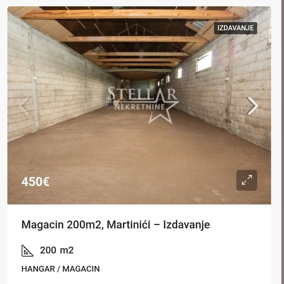 Izdaje se magacinski prostor u Martinićima. Povrsina prostora je 200m2. Tvrde je gradje, nema vlage. Dimenzije su 5,7m x 35m. Nalazi se pored puta, u dvorištu. Ima roll vrata. Moguće zakupiti za razne vrste djelatnosti. Hangar ima trofaznu struju, pa je moguće ubaciti i neke jače mašine, po potrebi. ID nekretnine M25 +382 69 618 445